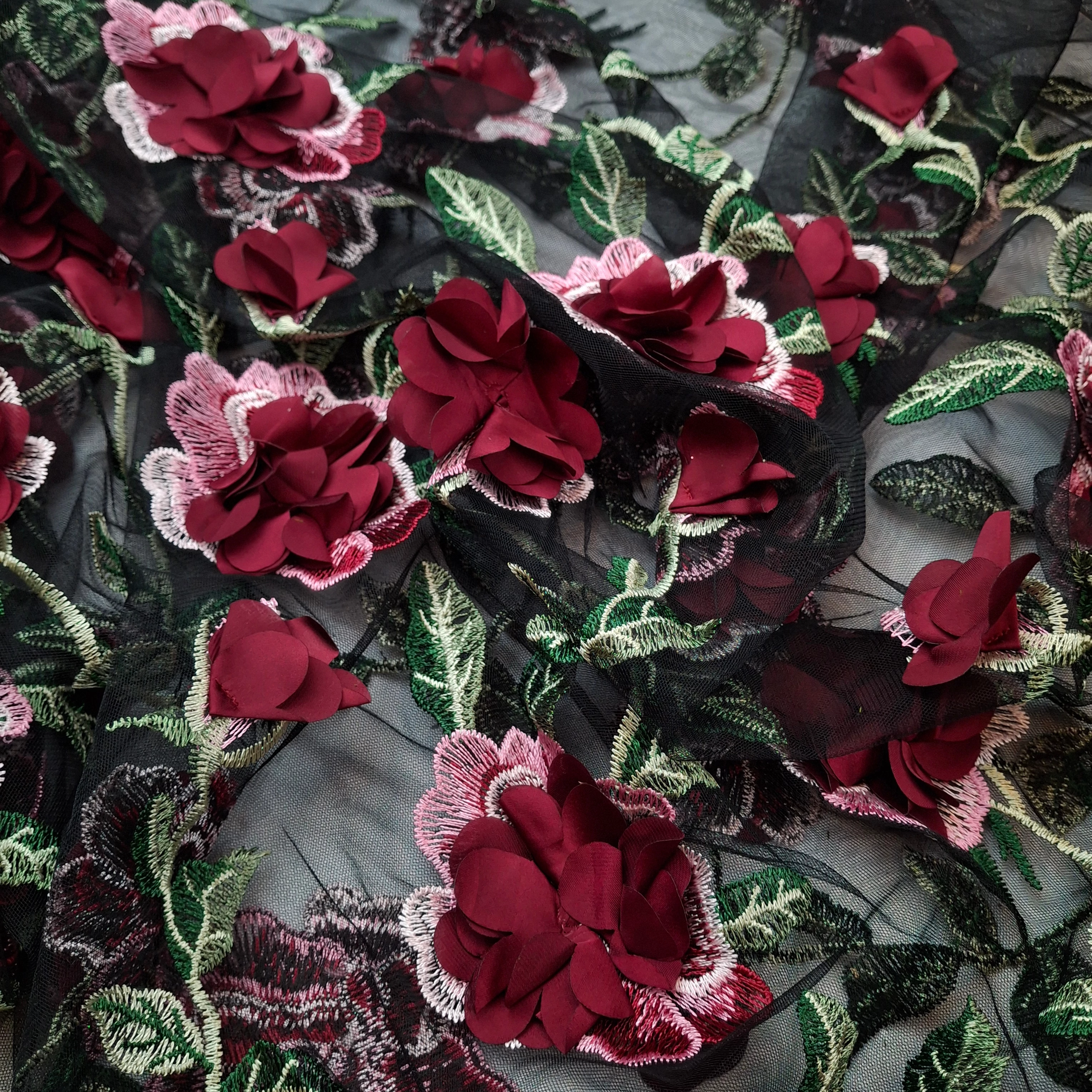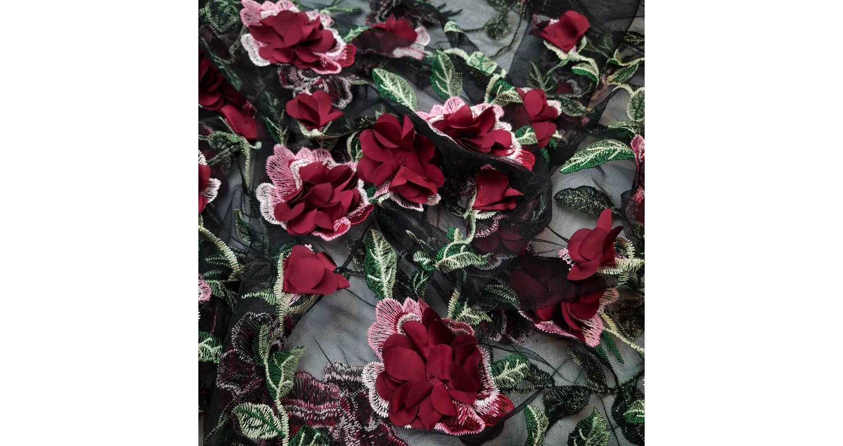 3D Alkalmi tüll méteráru fekete alapon bordó 3D kiemelkedő virágokkal. A tüll felülete emellett levelekkel és virágokkal is hímzett. A minta a méteráru egészén elterül, nem bordűrös.