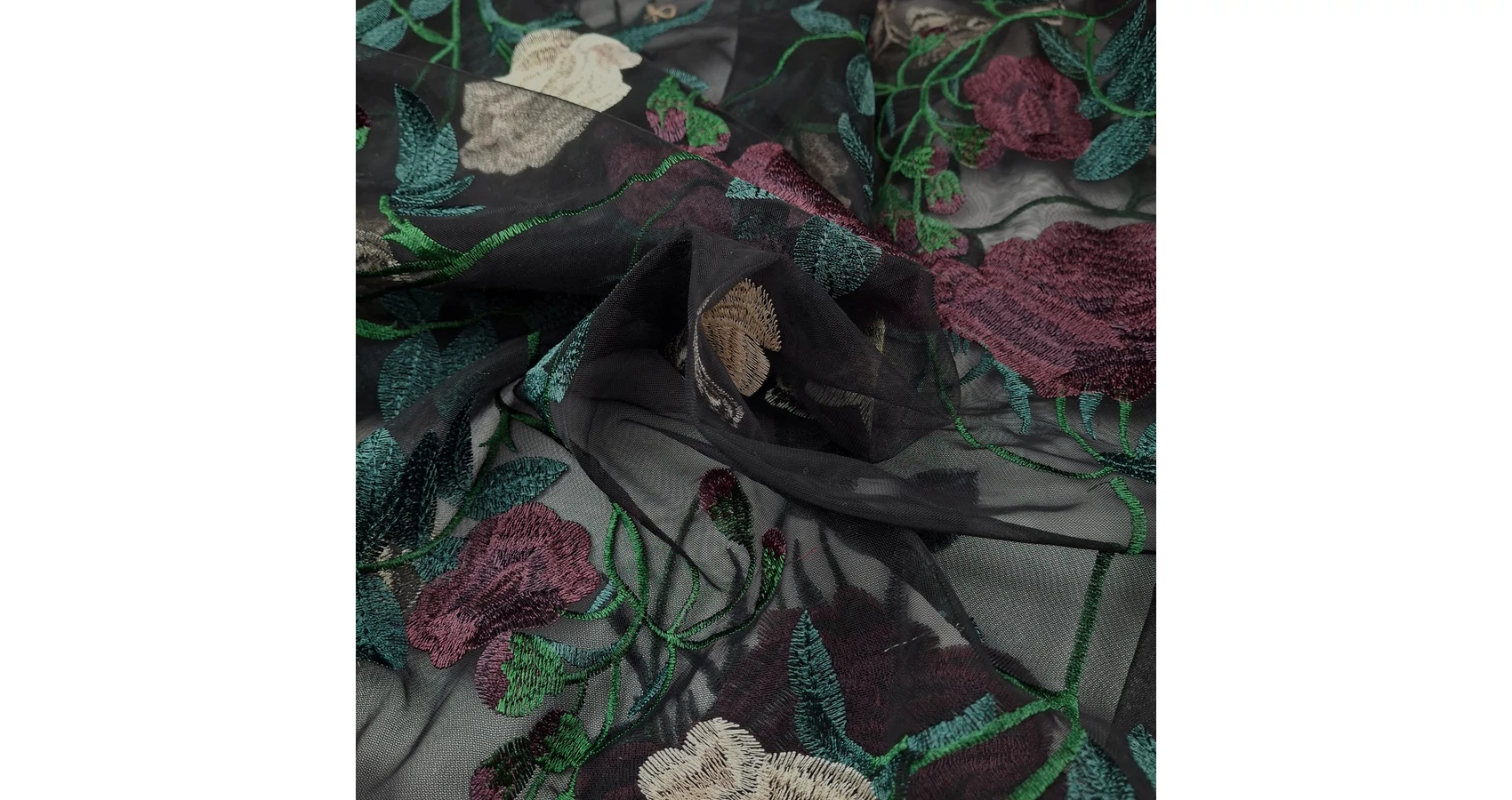 Alkalmi tüll méteráru fekete alapon, lila és vajszínű nagyméretű virág mintával. Nem bordűrös, nem rugalmas, elegáns kivitelezésű, dús megjelenésű különleges alkalmi anyag. Kifejezetten lágy, könnyen alakítható alapanyag.