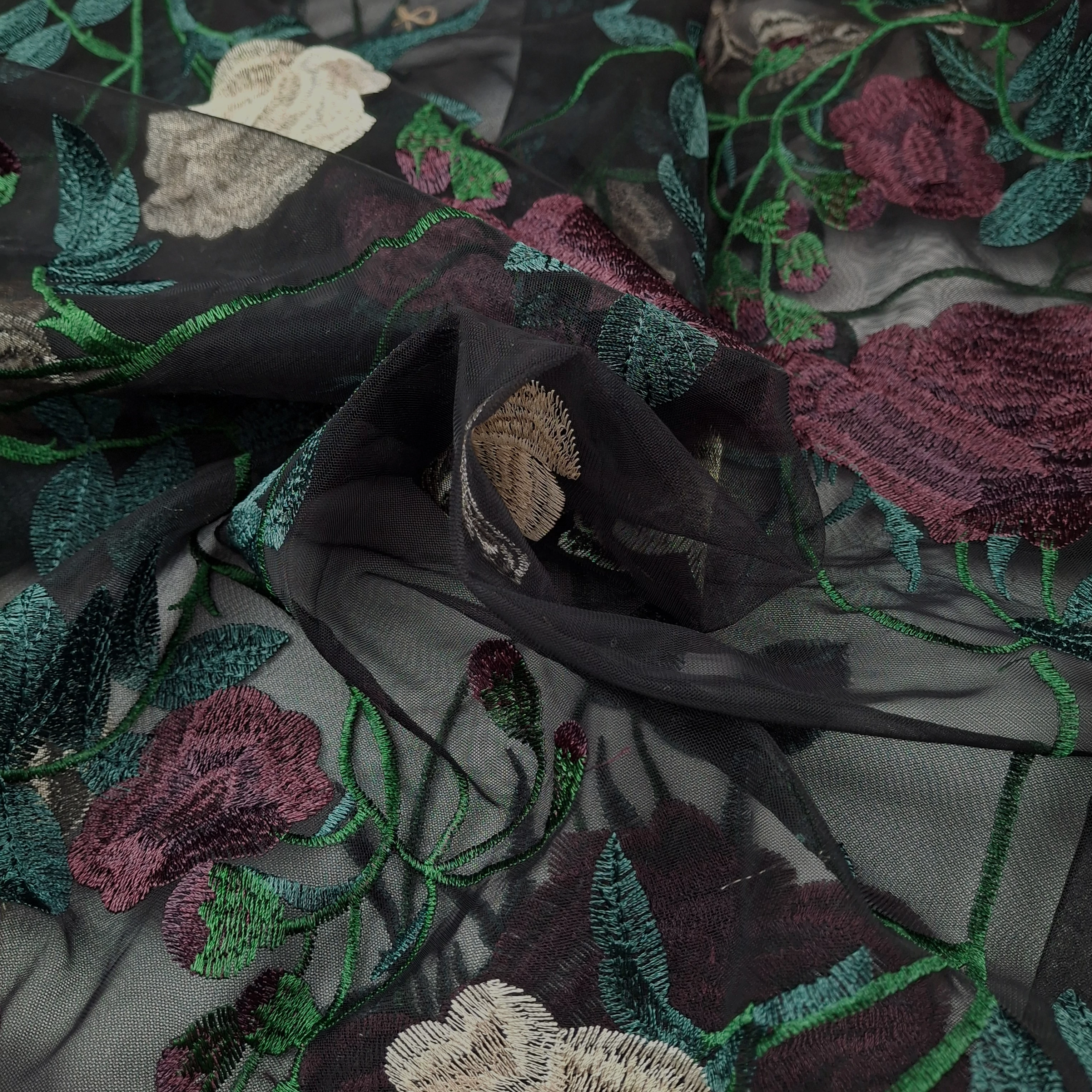 Alkalmi tüll – Fekete alapon lila és vajszínű hímzett virág mintával