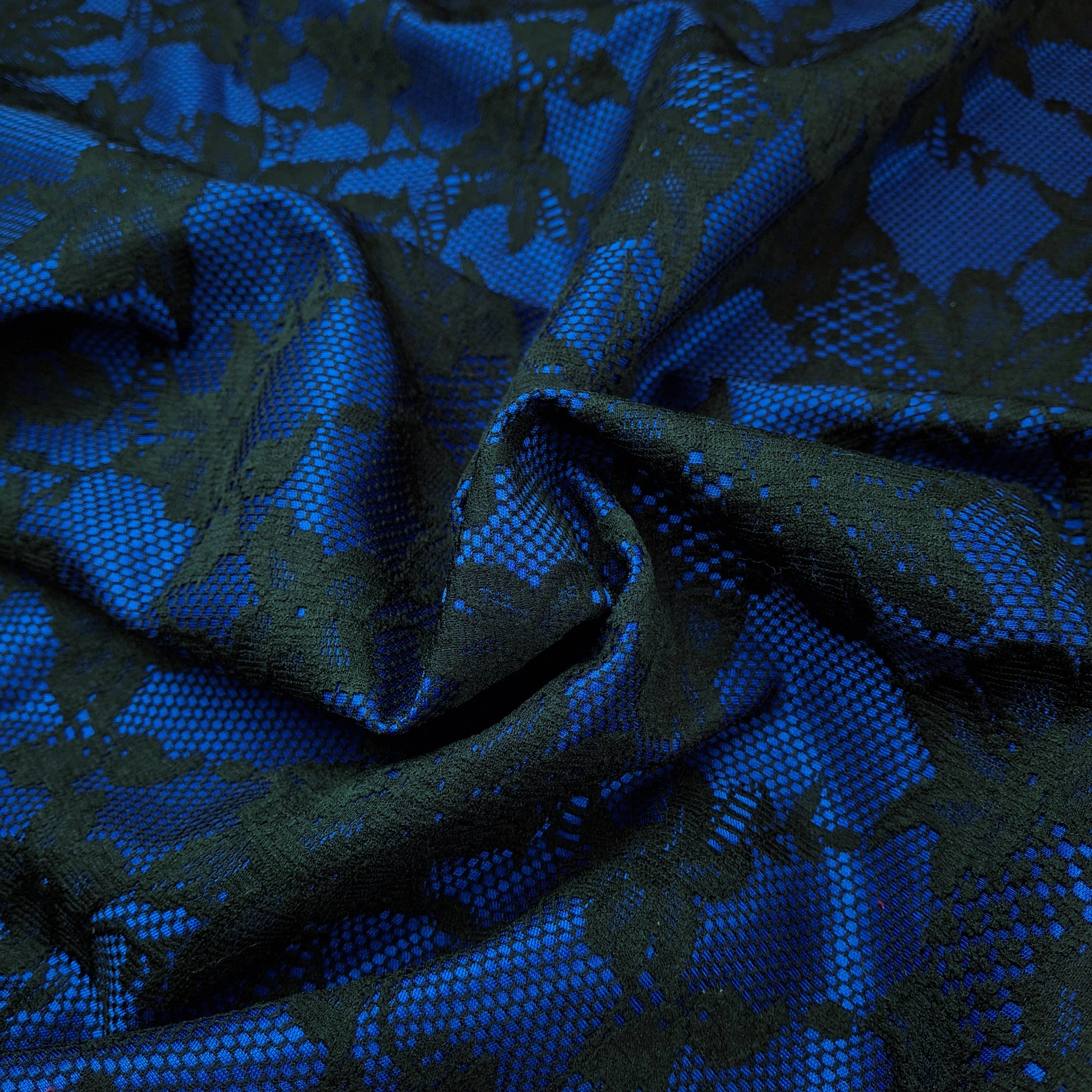 Csipke méteráru királykék jersey alapra aplikált fekete rózsás csipkével. Az alsó kék jersey anyag kereszt irányban rugalmas, a rajta elhelyezkedő csipke réteg némi tartást kölcsönöz az anyag egészének. Dús hatású, különleges, elegáns megjelenésű, mindkét szélén bordűrrel díszített csipke.