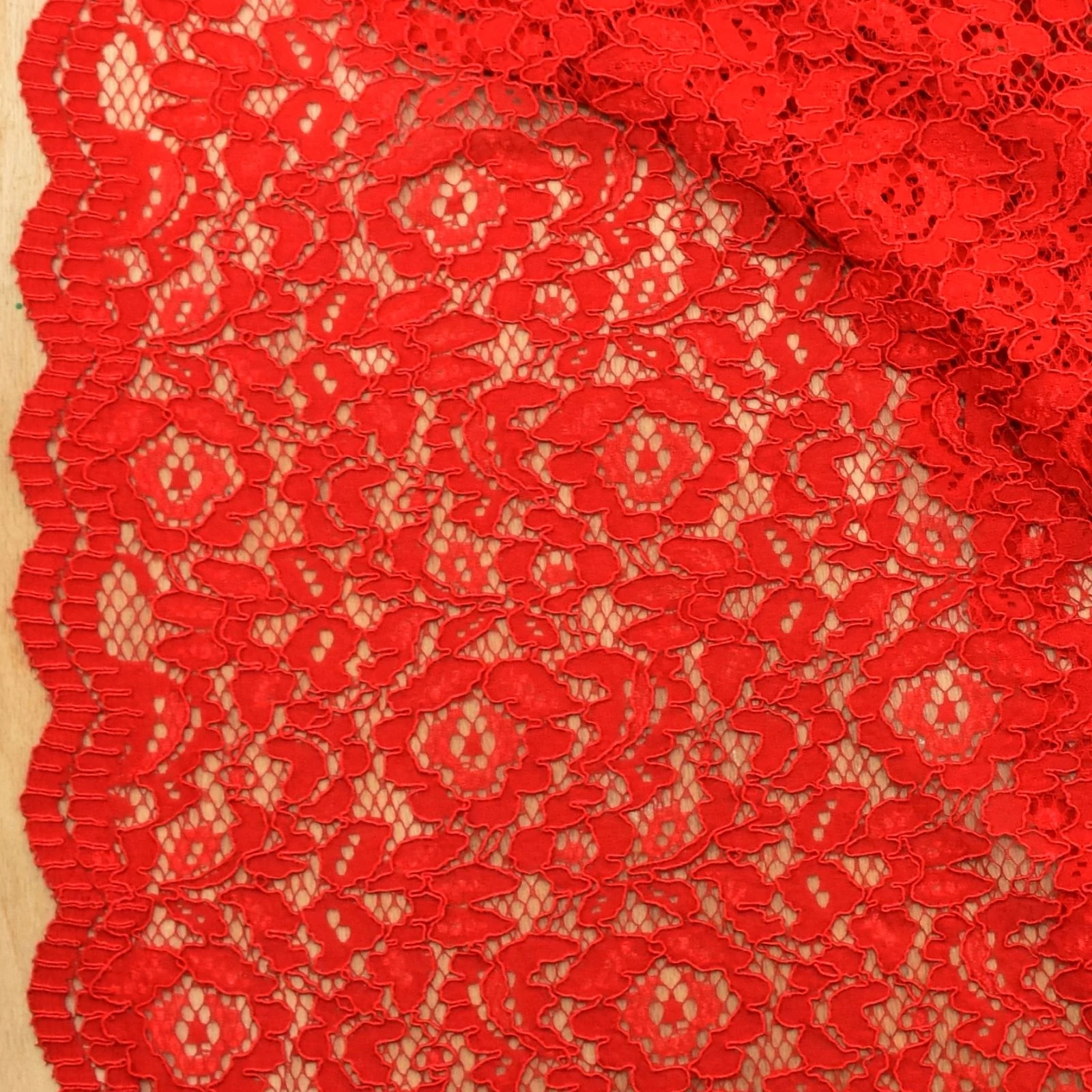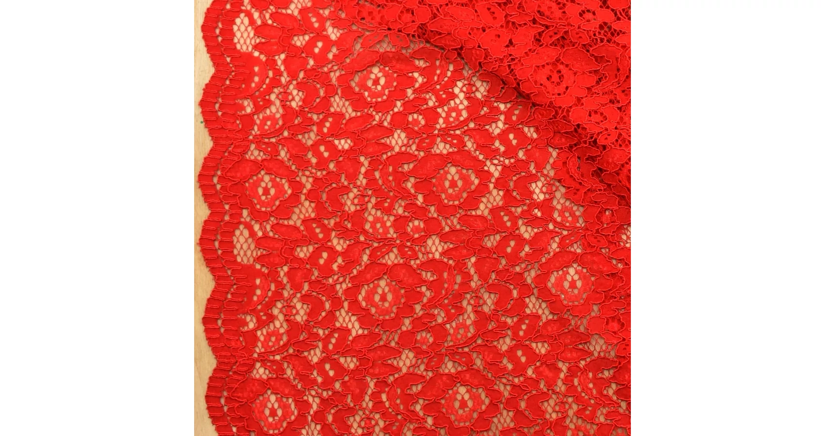 Csipke méteráru élénk piros színben, hálós alapon dús virág mintával. Szép esésű, kellemes tapintású, nem elasztikus alkalmi anyag, melynek szélei bordűrösek.