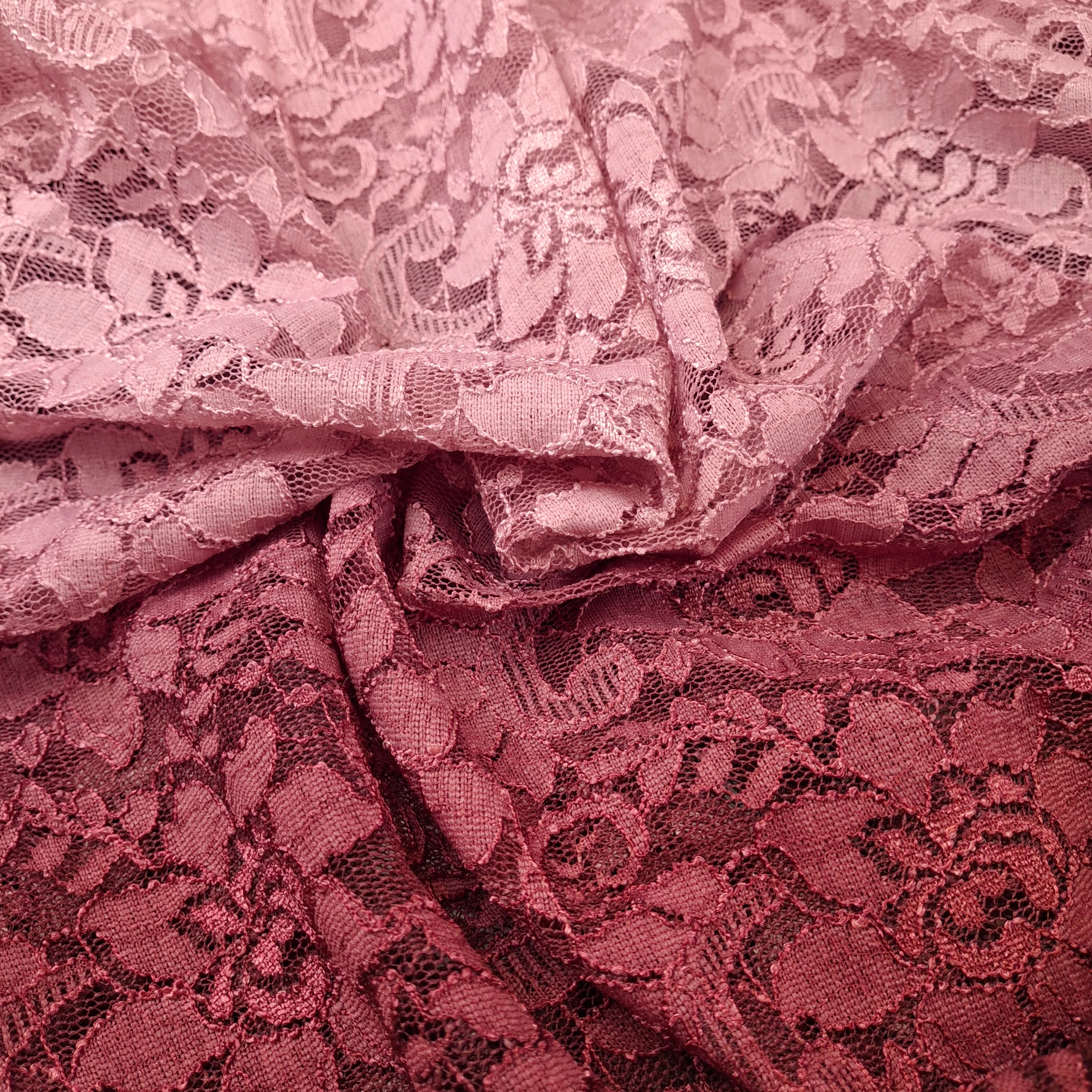 Ombre csipke méteráru, bordóból mályva színbe átfutva. Különleges megjelenésű, lágy esésű, kellemes tapintású alkalmi textil, melynek mindkét széle bordűrös. A színátmenet enyelő arányban oszlik el az anyag szélességén, pontban középen találkozva.