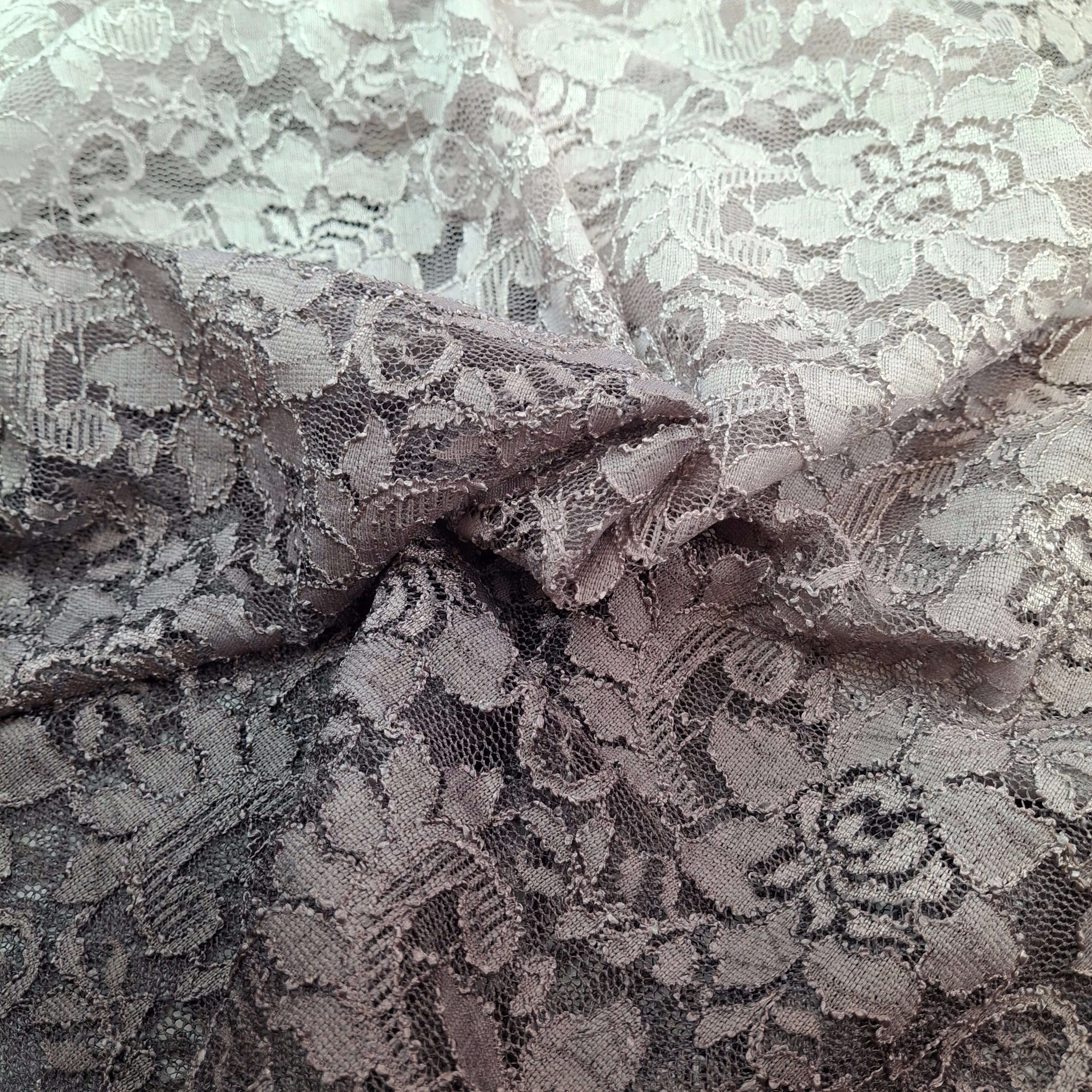 Ombre csipke méteráru, taupe/tób színből bézs színbe átfutva. Különleges megjelenésű, lágy esésű, kellemes tapintású alkalmi textil, melynek mindkét széle bordűrös. A színátmenet enyelő arányban oszlik el az anyag szélességén, pontban középen találkozva.