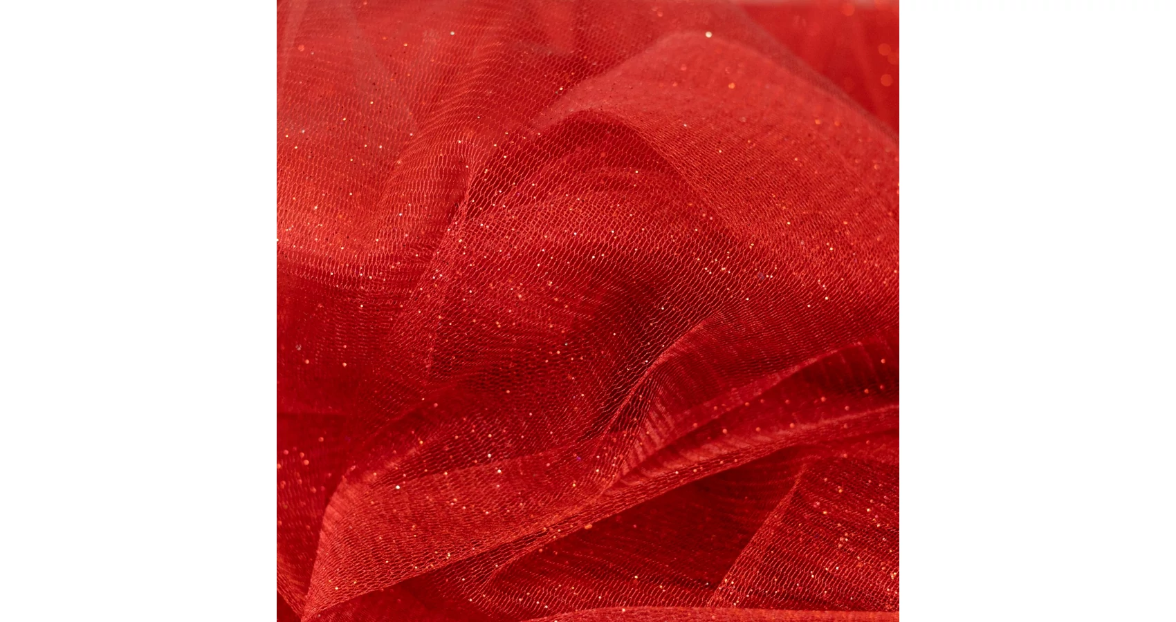 Csillámos tüll méteráru piros alapon piros glitterekkel gazdagon díszítve. Elasztikus, közepes tartású, rendkívül látványos megjelenésű alkalmi textil, mely gyűrődésre nem hajlamos. Csillámai felhasználás közben hullanak, de még hosszútávú használatot követően is kellő mennyiségű marad rajta. Mosását kerüljük.