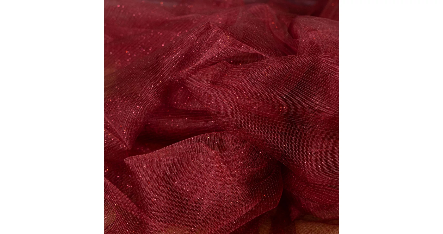 Csillámos tüll méteráru bordó alapon bordó színű glitterekkel gazdagon díszítve. Elasztikus, közepes tartású, rendkívül látványos megjelenésű alkalmi textil, mely gyűrődésre nem hajlamos. Csillámai felhasználás közben hullanak, de még hosszútávú használatot követően is kellő mennyiségű marad rajta. Mosását kerüljük.