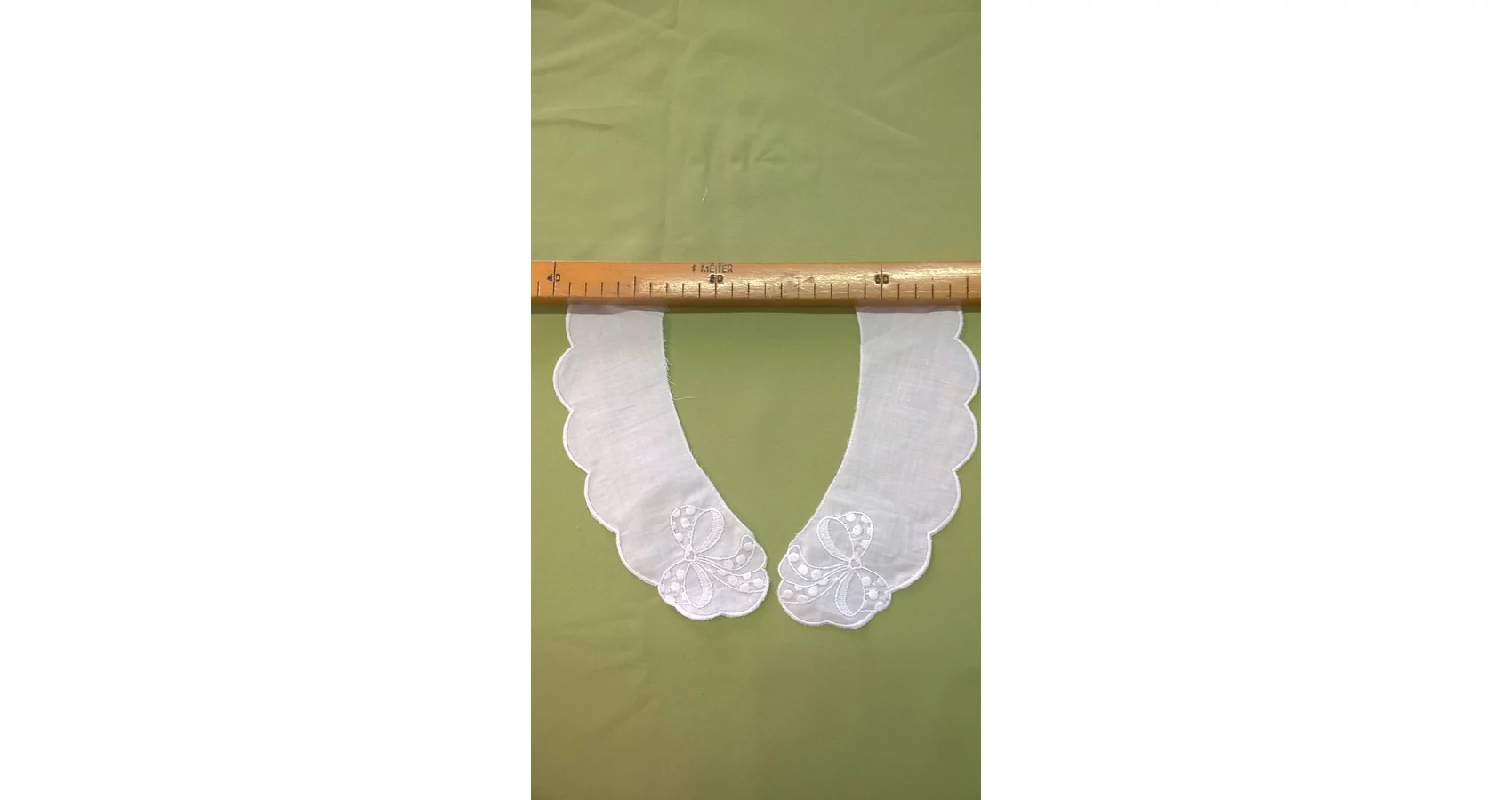 Fehér színű matt cérnával kivarrt U alakú csipkegallér masni mintával. A kész termékre utólag, akár kézzel, akár géppel is könnyedén felvarrható, gyors és látványos dekorációs elem. Néhány gyönggyel kivarrva vagy strasszkővel díszítve egyedi ékszer készíthető belőle.