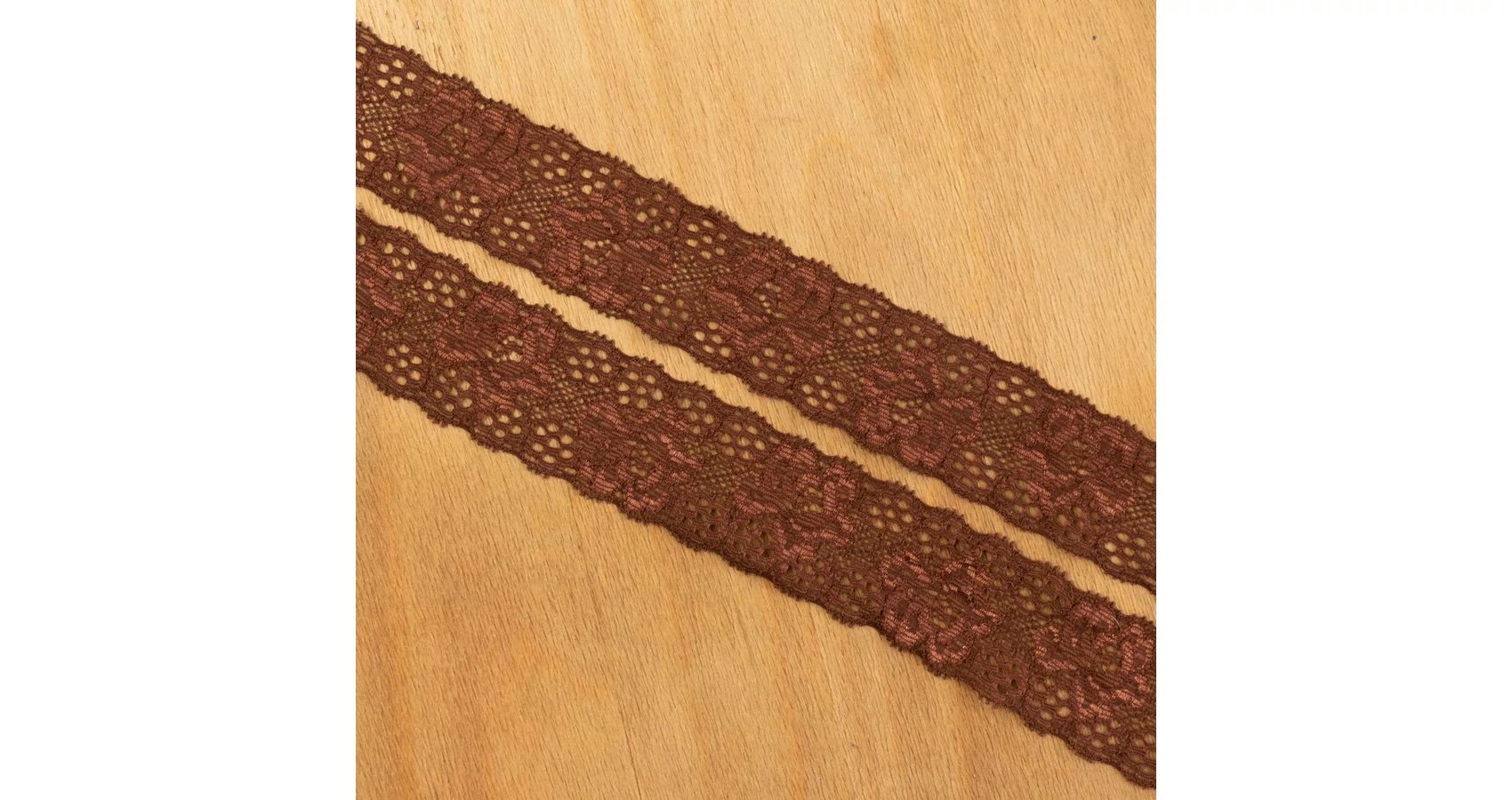 Elasztikus csipkeszalag barna színben, virágos mintával. Szimmentrikus szélű, néhol hamvas felületű csipke, mely hosszanti irányban elasztikus.