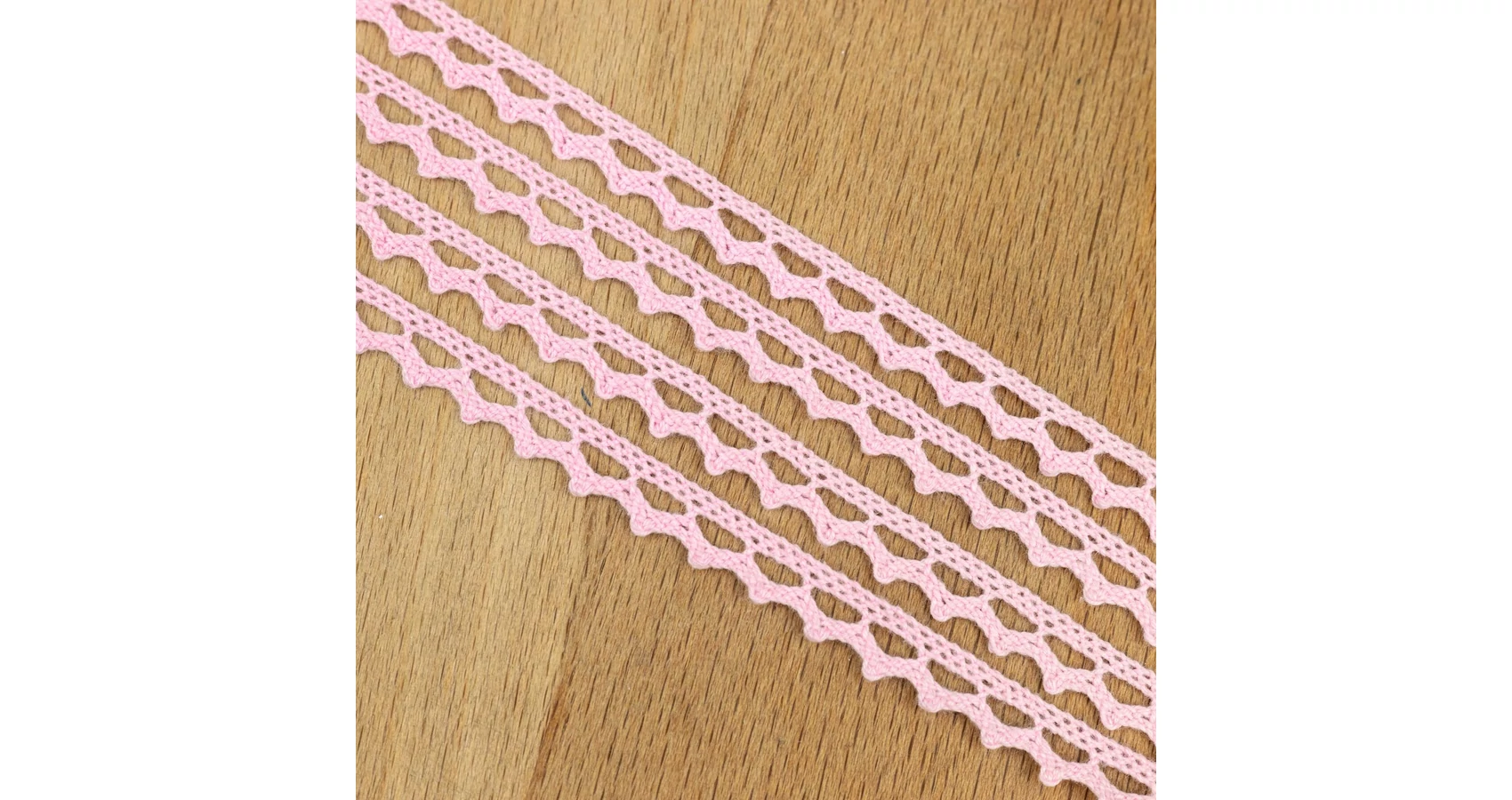 Pamut csipke szalag rózsaszín színben. Egyik szélén cakkos, matt felületű, nem elasztikus, horgolt hatású látványos csipkeszalag.