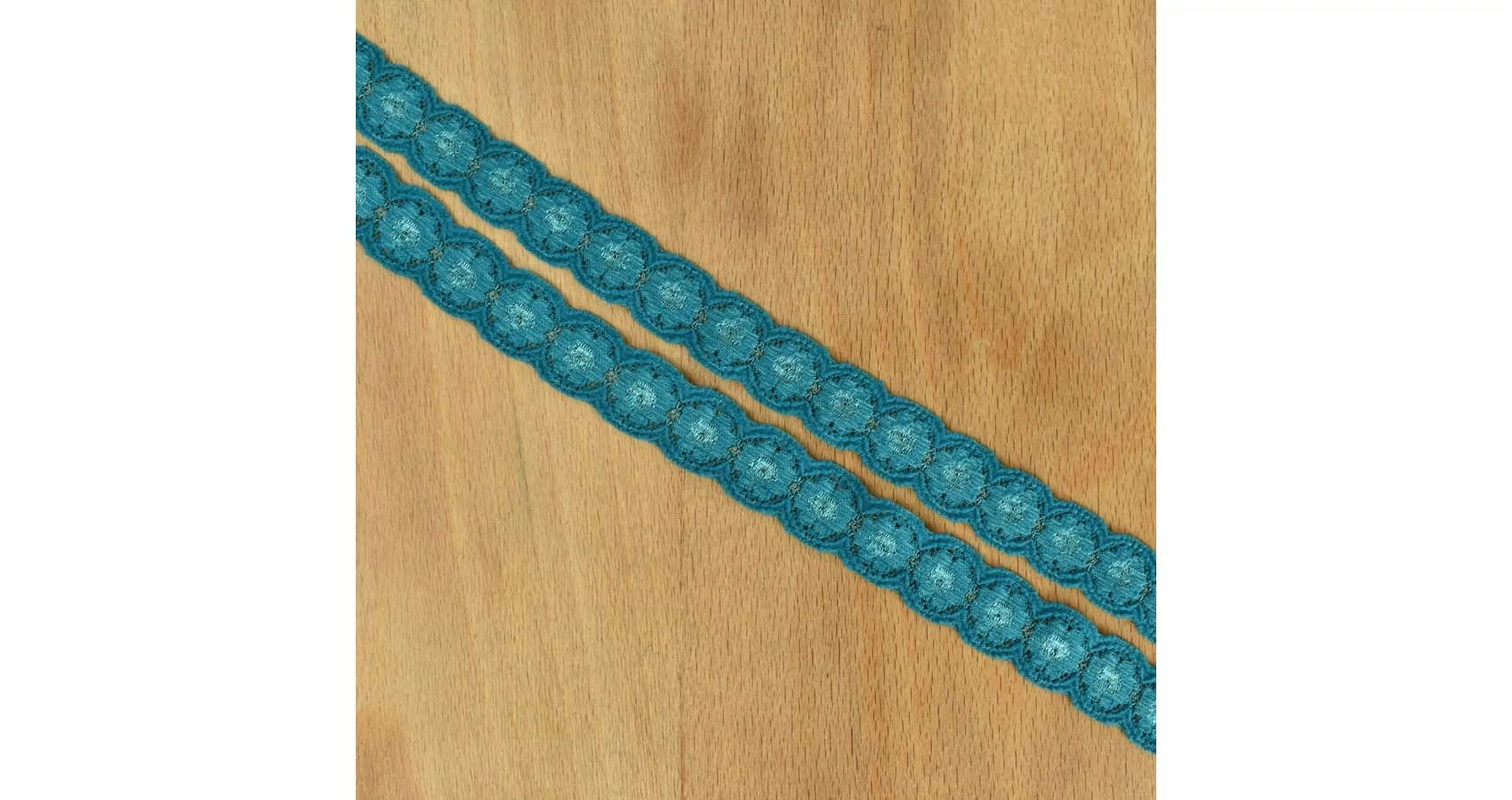 Elasztikus csipkeszalag türkizzöld színben, virág mintával. Szimmetrikus szélű csipke, mely hosszanti irányban elasztikus.