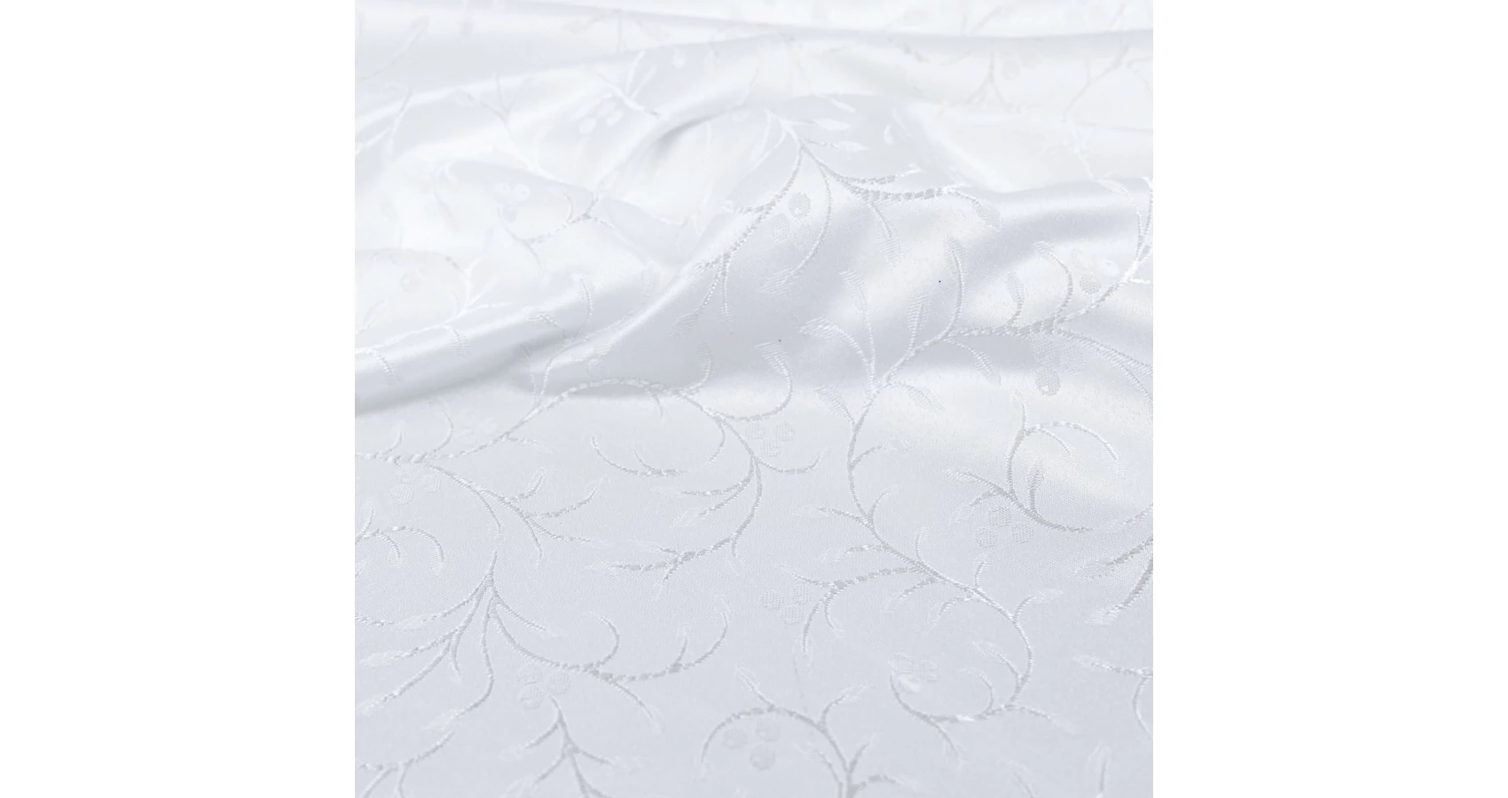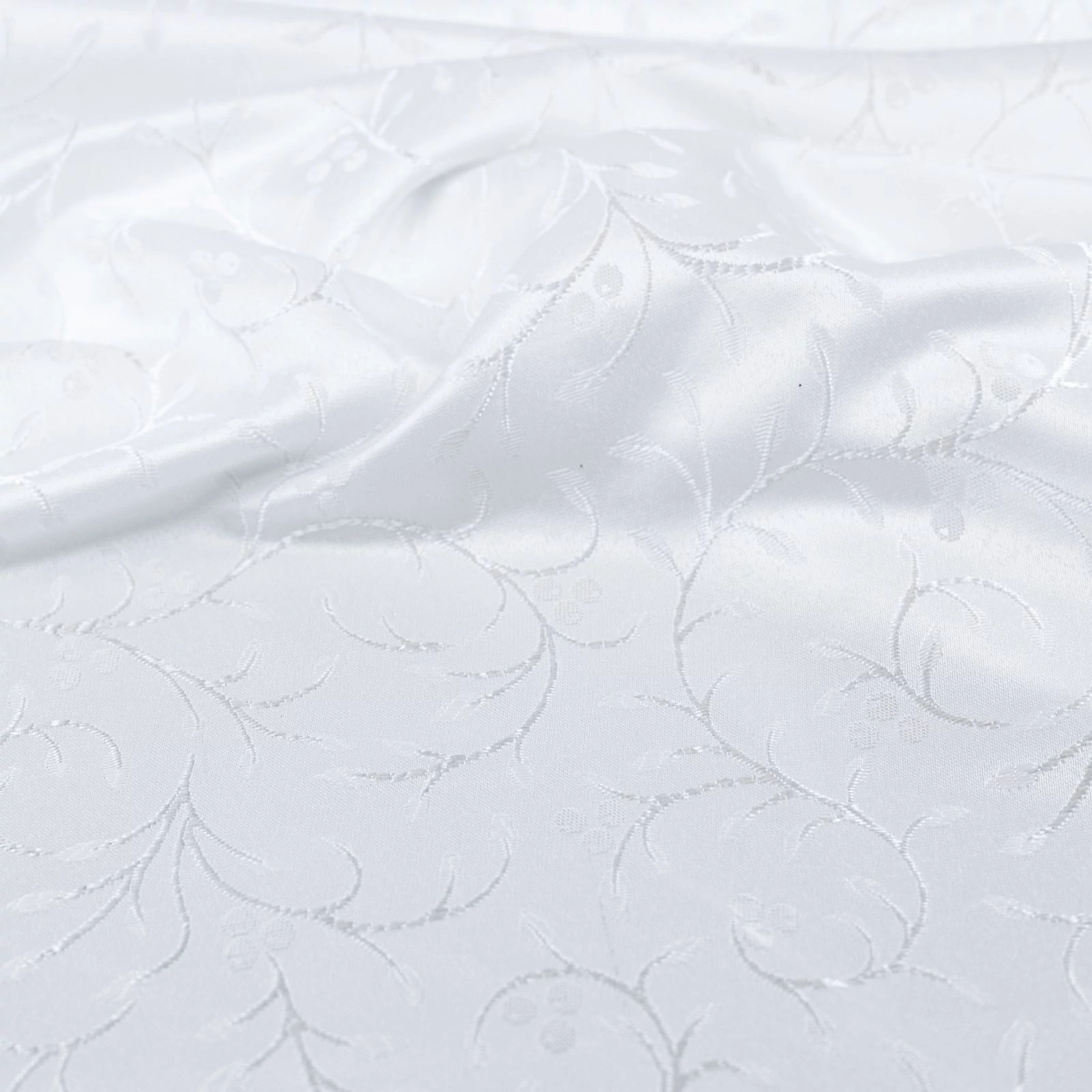 Jacquard méteráru hófehér színben tekergőző leveles mintával. Jó tartású, elegánsan fénylő, dús anyag, mely vasalást nem igényel, elég mosás után felakasztva szárítani és a ráncok maguktól kisimulnak. Felhasználás előtt érdemes beavatni.