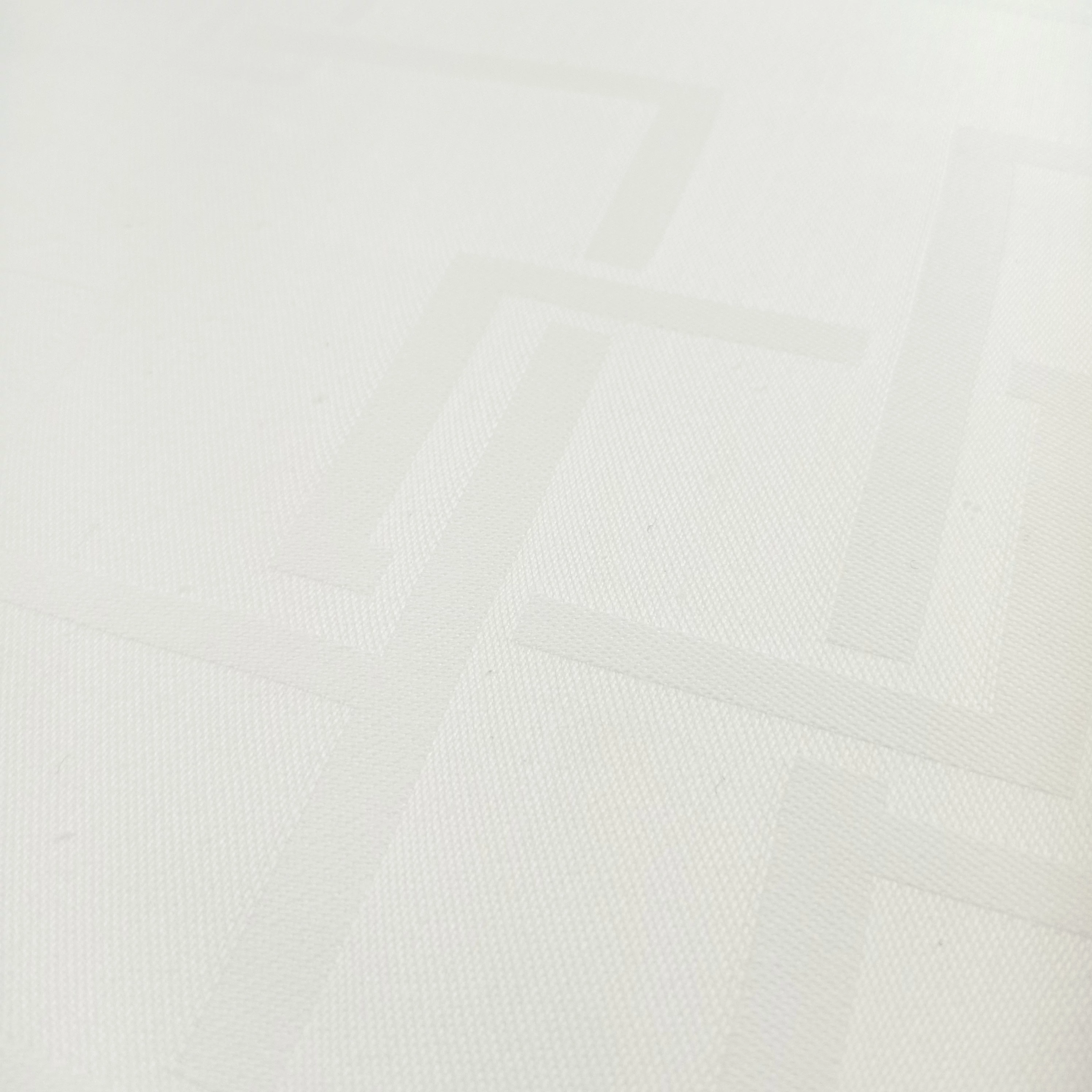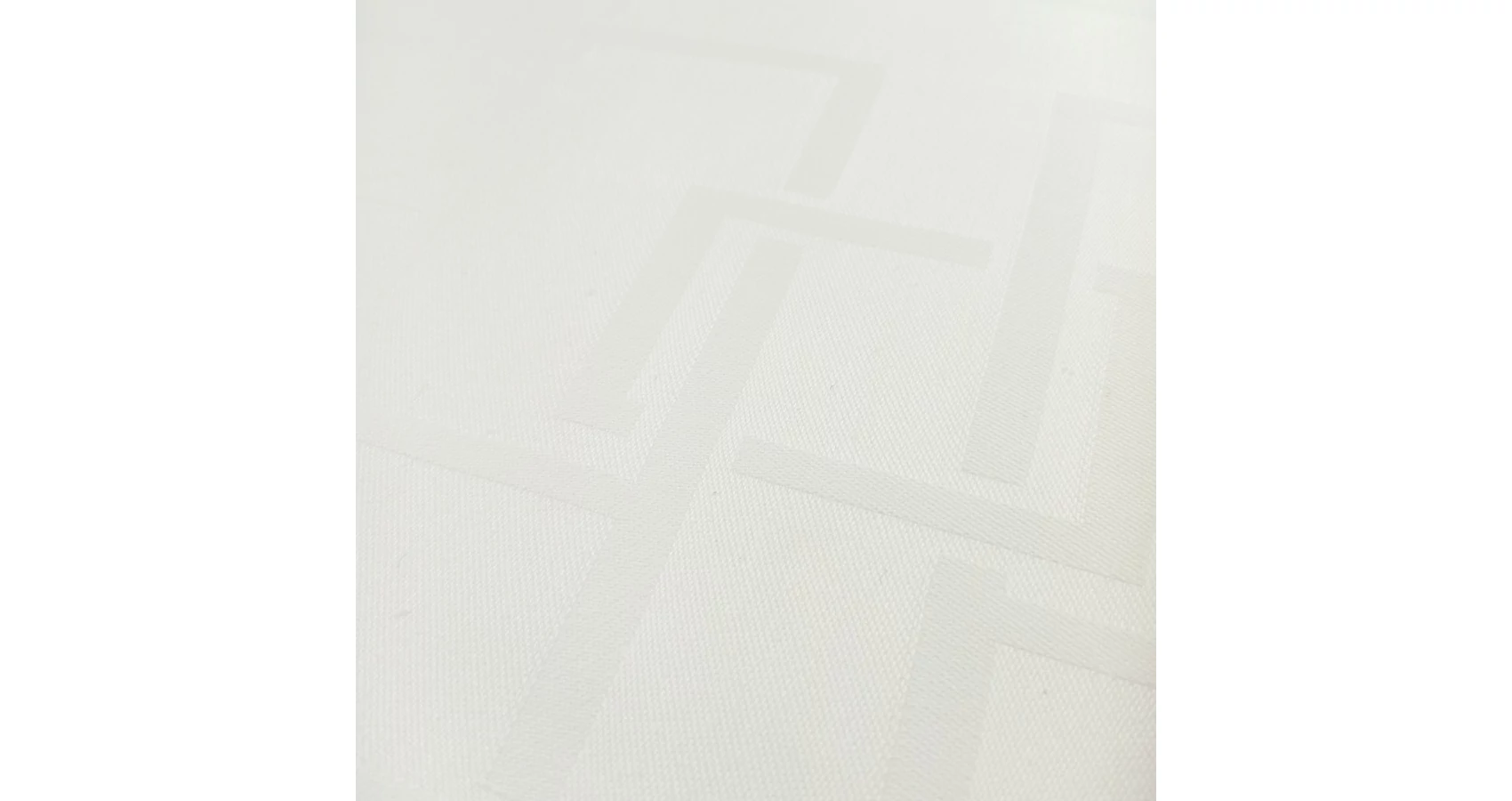Jacquard méteráru hófehér színben, geomterikus vonal mintával. A minta magát az anyag strukturáját képezi. Jó tartású, elegánsan fénylő, dús anyag. Felhasználás előtt érdemes beavatni. Éttermi, vagy vendéglátói egységek közkedvelt klasszikus asztalterítő alapanyaga.