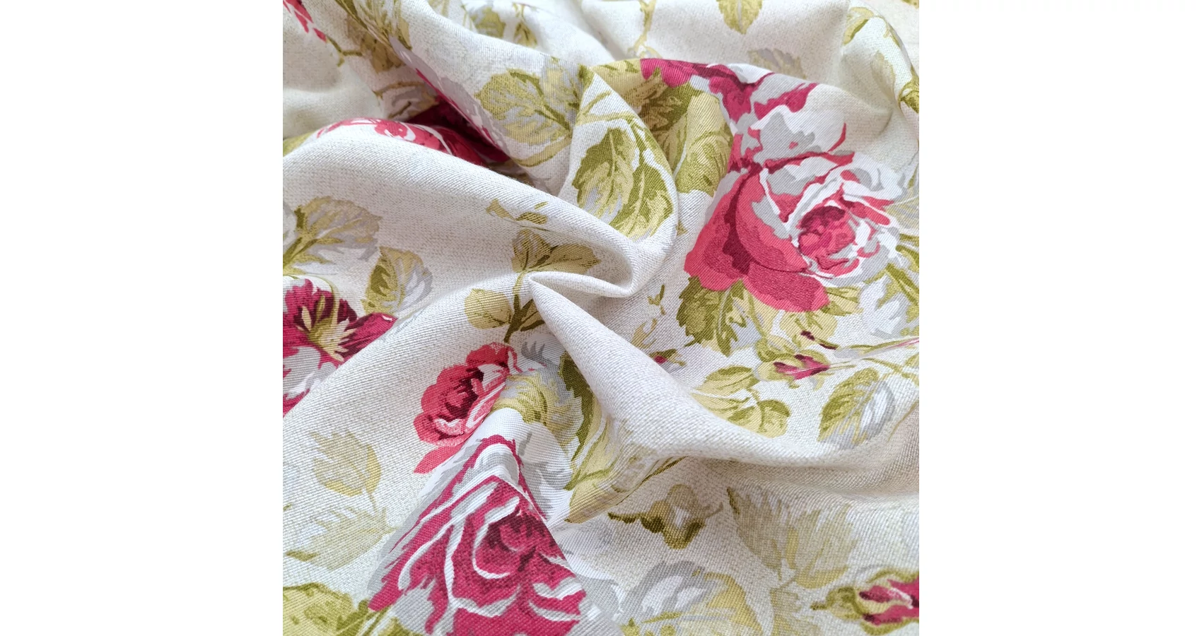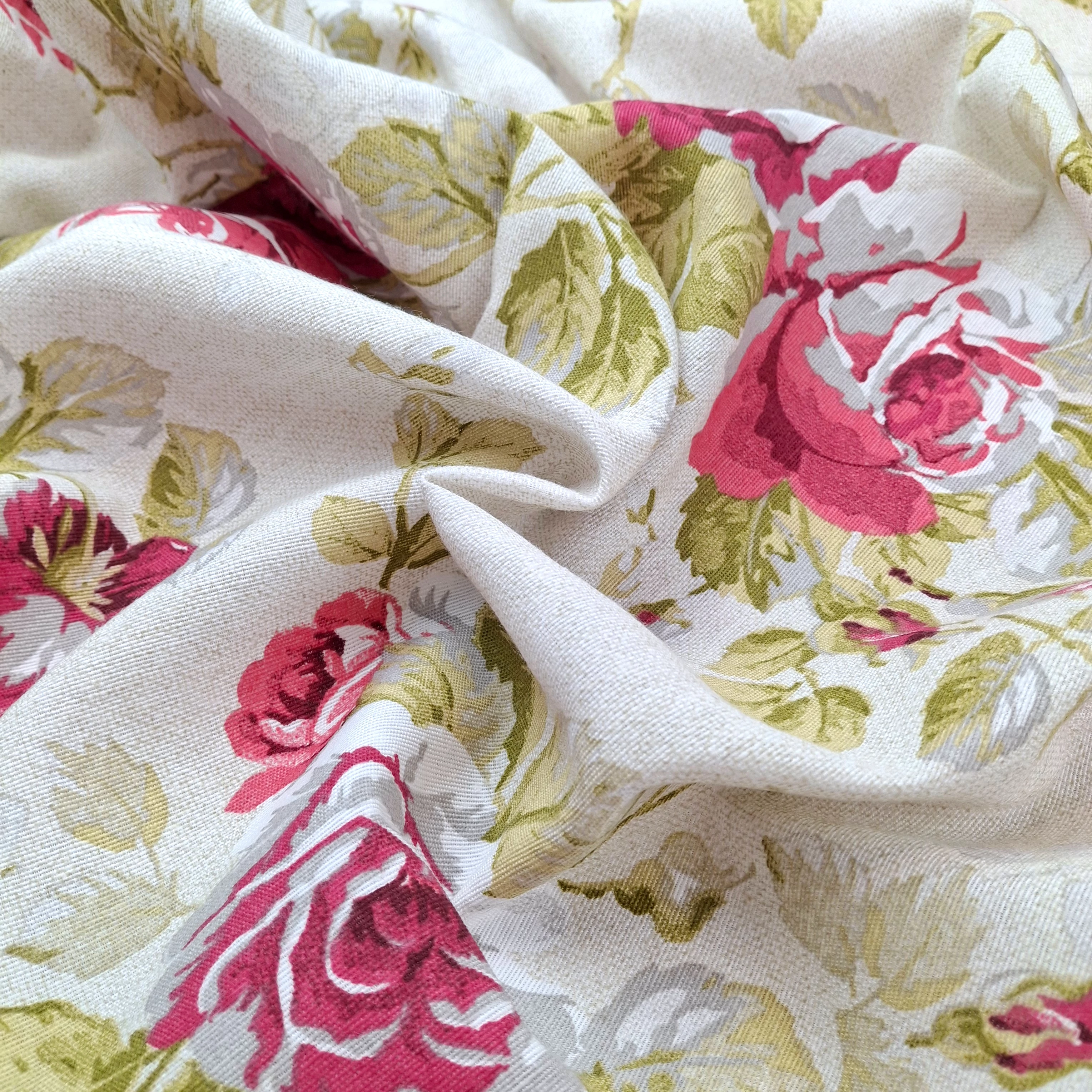 Dekorvászon méteráru bézs alapon ciklámen színű rózsa mintával. Erős, strapabíró textil, mely rendkívül sokoldalúan felhasználható, kreatív alapanyag. Műszál tartalmának köszönhetően zsugorodása csekély, csupán 3-5%-kal kell számolni, felhasználás előtt azonban mégis ajánlott beavatni.