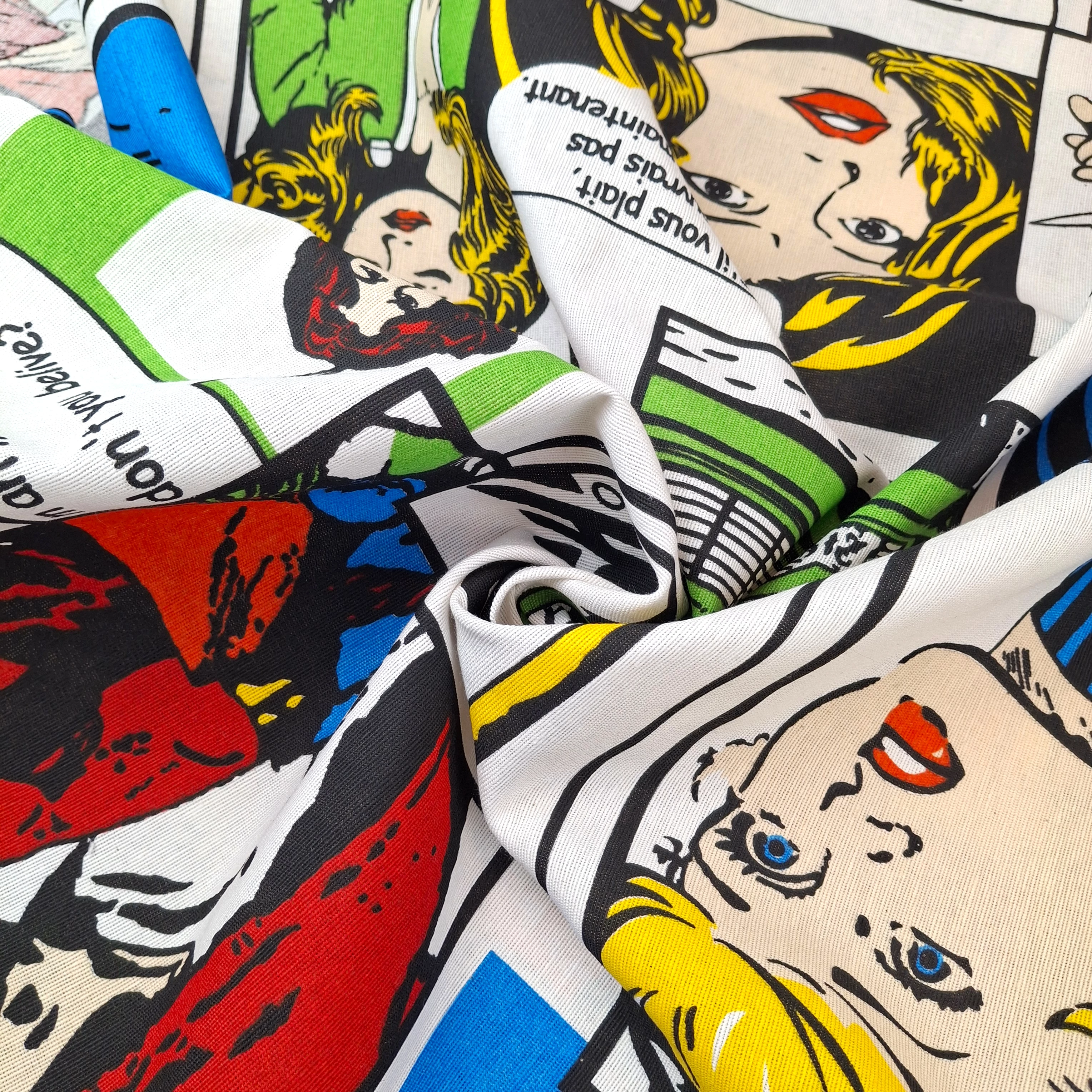 LONETA Dekorvászon méteráru nagyméretű képregényes mintával. Extra széles, erős, strapabíró textil, rendkívül sokoldalúan felhasználható, kreatív alapanyag.