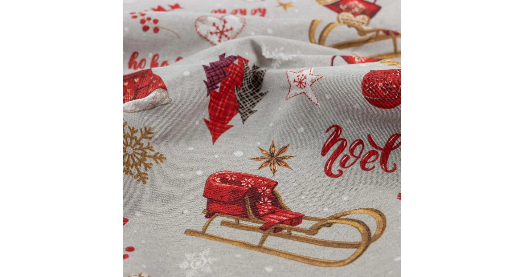 Karácsonyi dekorvászon méteráru világos szürke alapon színes karácsonyi mintával. Erős, strapabíró textil, mely rendkívül sokoldalúan felhasználható, kreatív alapanyag. Műszál tartalmának köszönhetően zsugorodása csekély, csupán 3-5%-kal kell számolni, felhasználás előtt azonban mégis ajánlott beavatni.