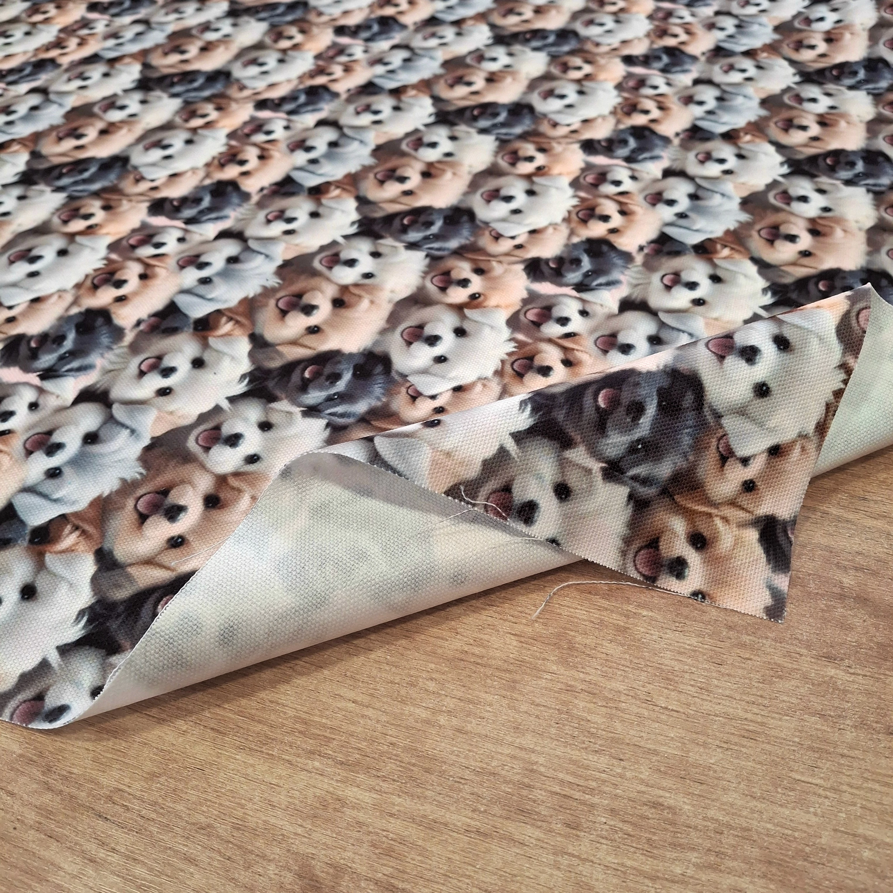 Vízlepergető anyag kiskutyás mintával. Erős, jó tartású, strapabíró, közepesen merev anyag, mely háztartási géppel is jól varható. Az anyag hátulján PVC réteg található, ami biztosítja a vízzáró réteget.