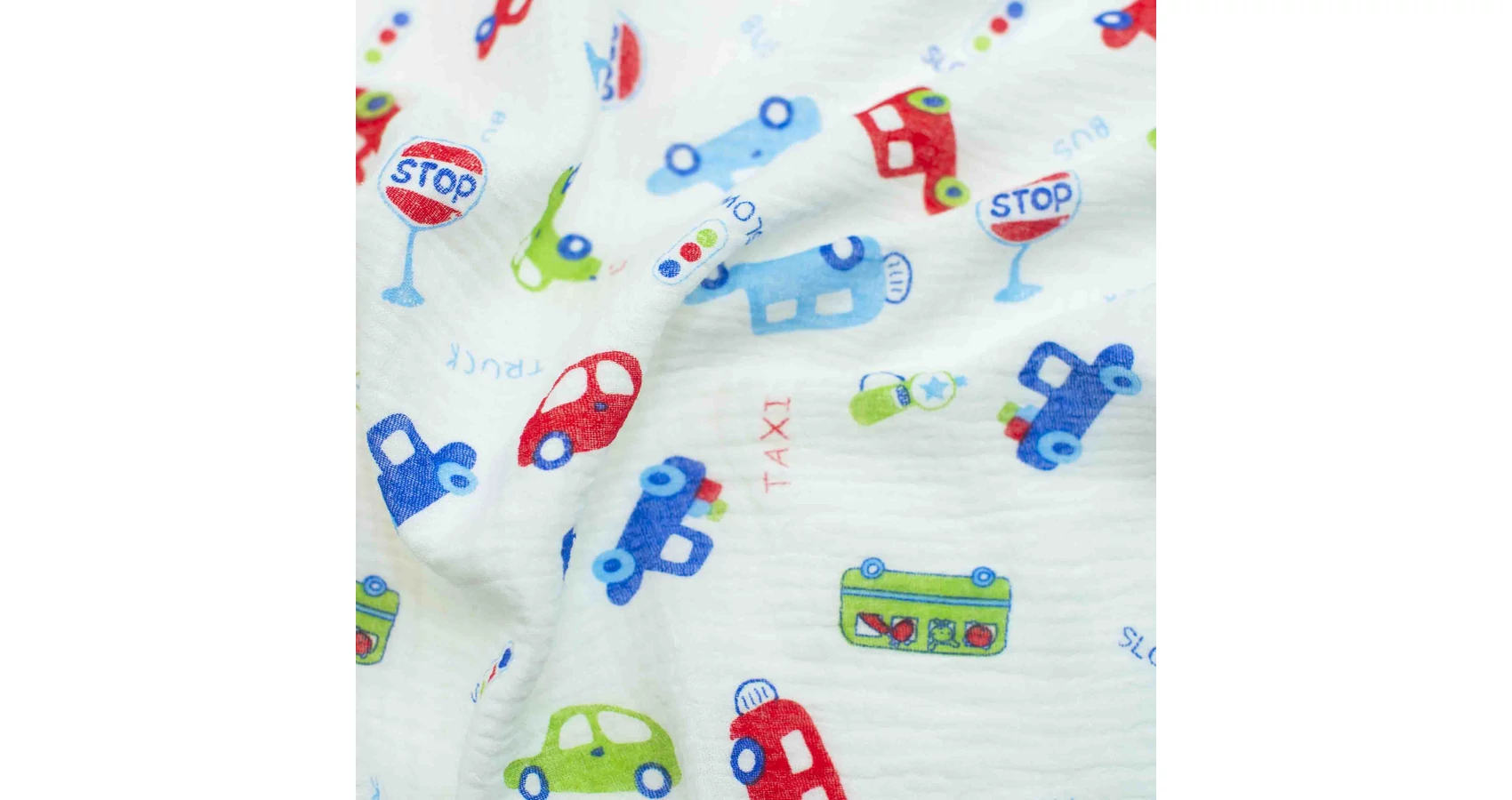 Dupla géz méteráru fehér színben, színes autós mintával. Finom, puha tapintású, gyűrt géz anyag, mely a két vékony géz réteg összeillesztésének köszönhetően nem átlátszó. Rendkívül jó légáteresztő képességű, bőrbarát, nagy igénybevételt is bíró különleges nyári pamut szövet. Mosást követően gyűrve érdemes teregetni, így megőrzi a gyártáskor kapott gyűrött felületét. Amennyiben magas hőfokú mosást igénylő termék (pl. nyálfogó kendő, babakendő) készül belőle, beavatáskor 10-12%-os zsugorodással kell számolni.