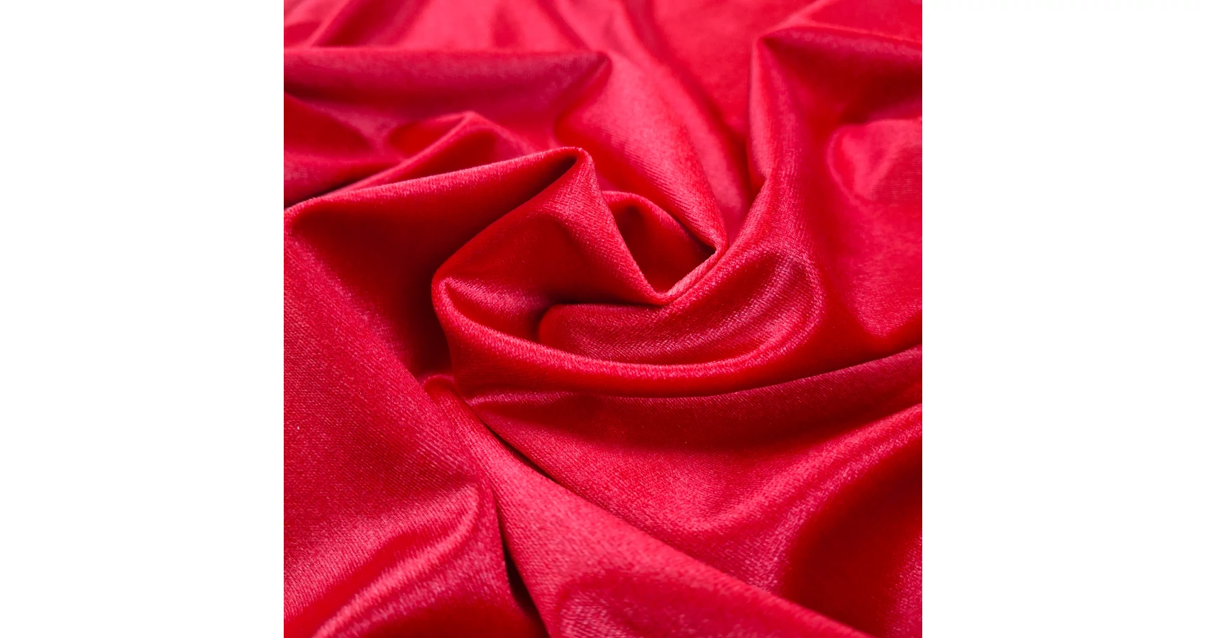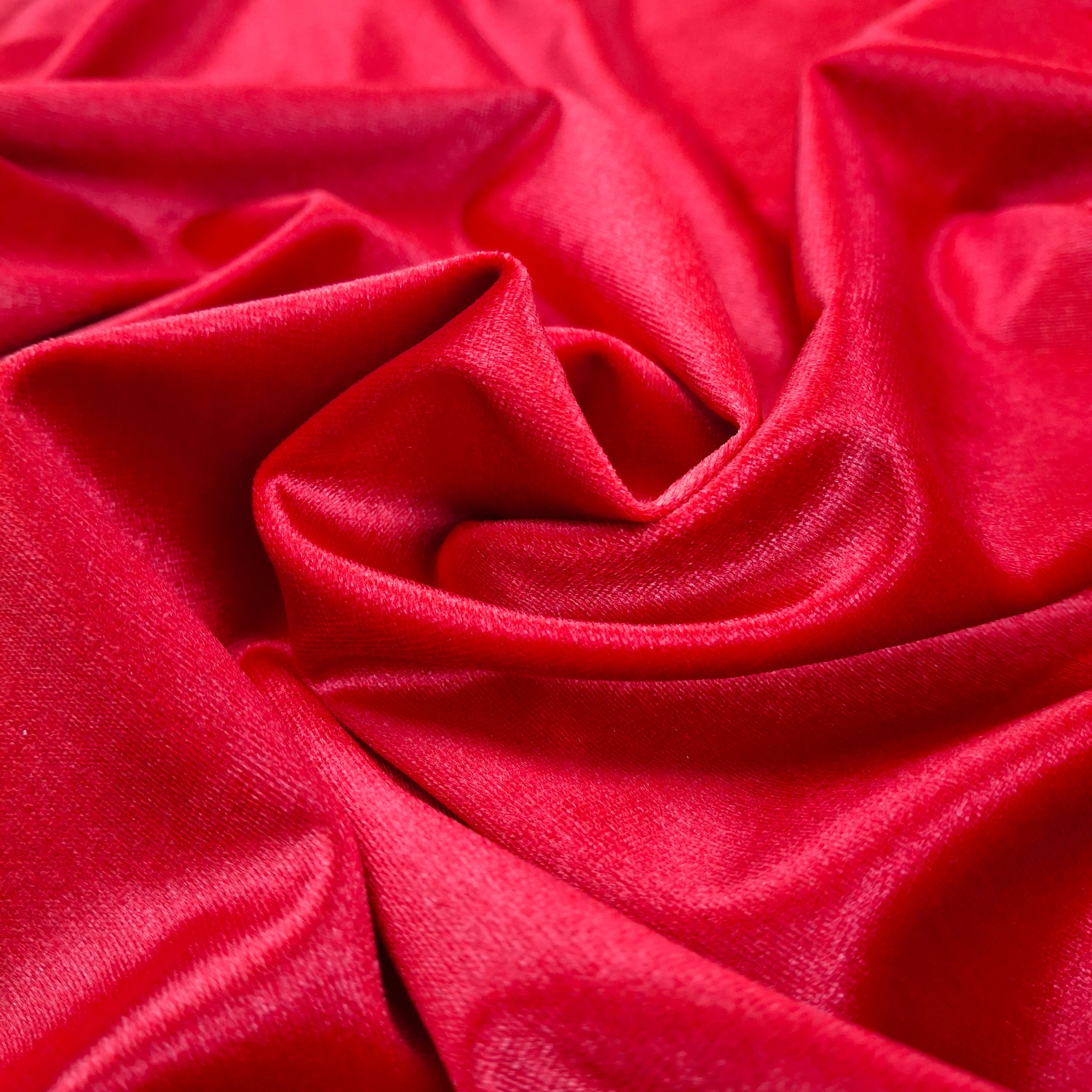 Elasztikus plüss méteráru piros színben. Puha, mindkét irányban rugalmas, sokrétűen felhasználható alapanyag. Kissé velúros, cirmosan megcsillanó fényes felülettel rendelkezik.