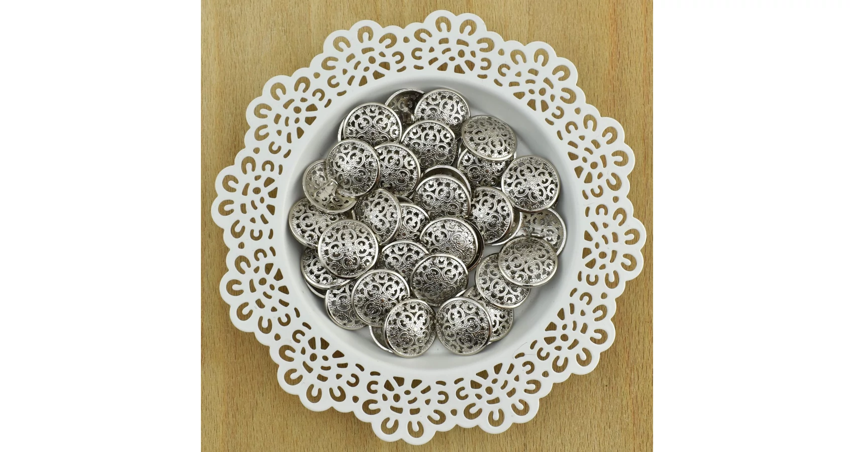 Fém gomb világos ezüst színben, bizánci stílusú dekoratív mintával. Szép fényű, domború füles divatgomb.