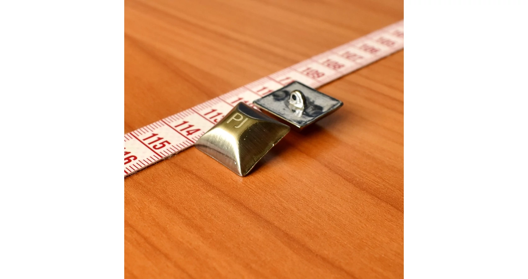 Fém gomb antik ezüst színben, PJ felirattal díszítve. Dekoratív megjelenésű, hamvas fényű, hátul varrós, ún. "füles" gomb.