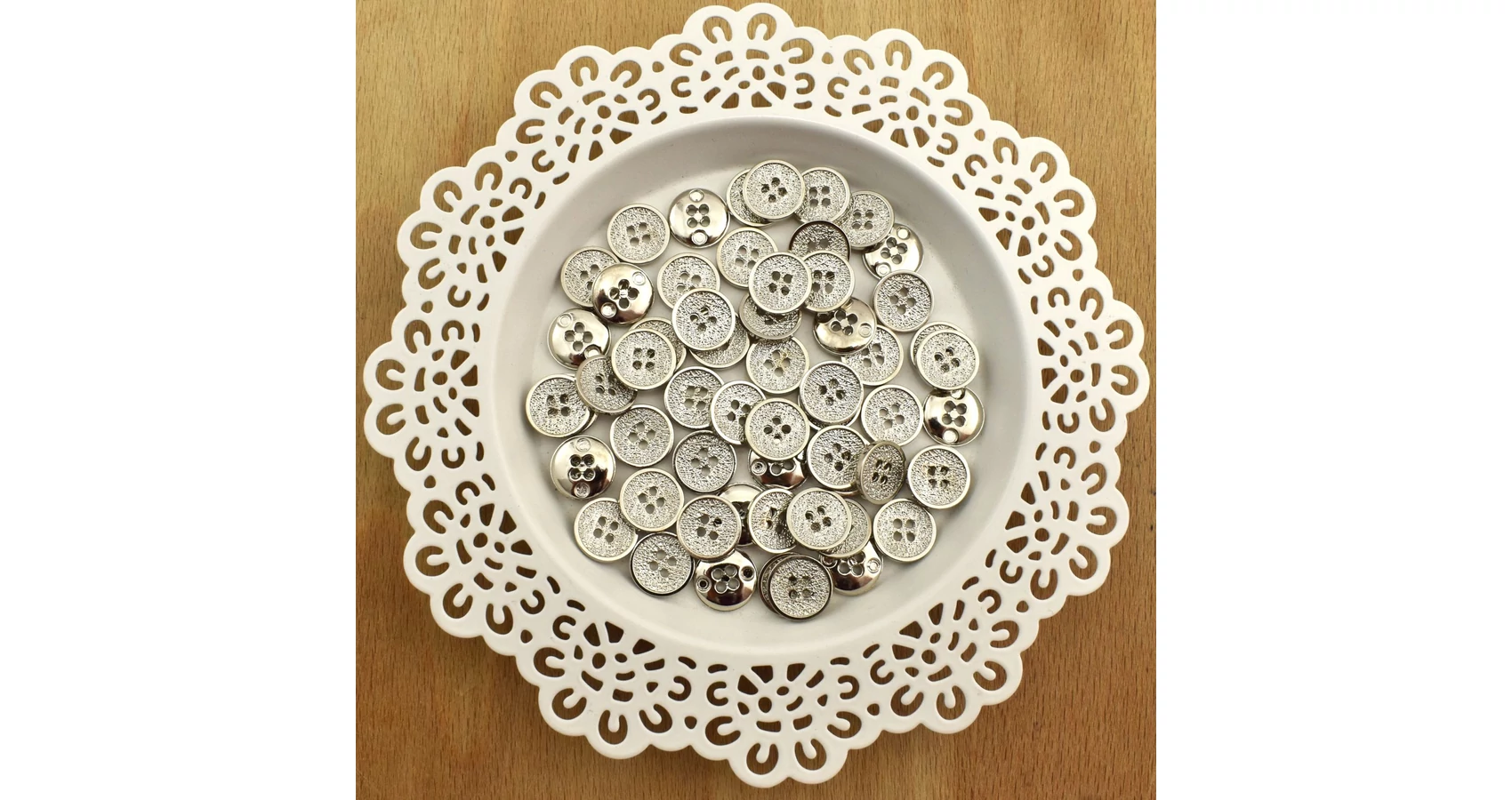Műanyag gomb fényes ezüst színben, dekoratív, szálazott mintával. Szépen fénylő, vékony peremű négylyukú gomb.