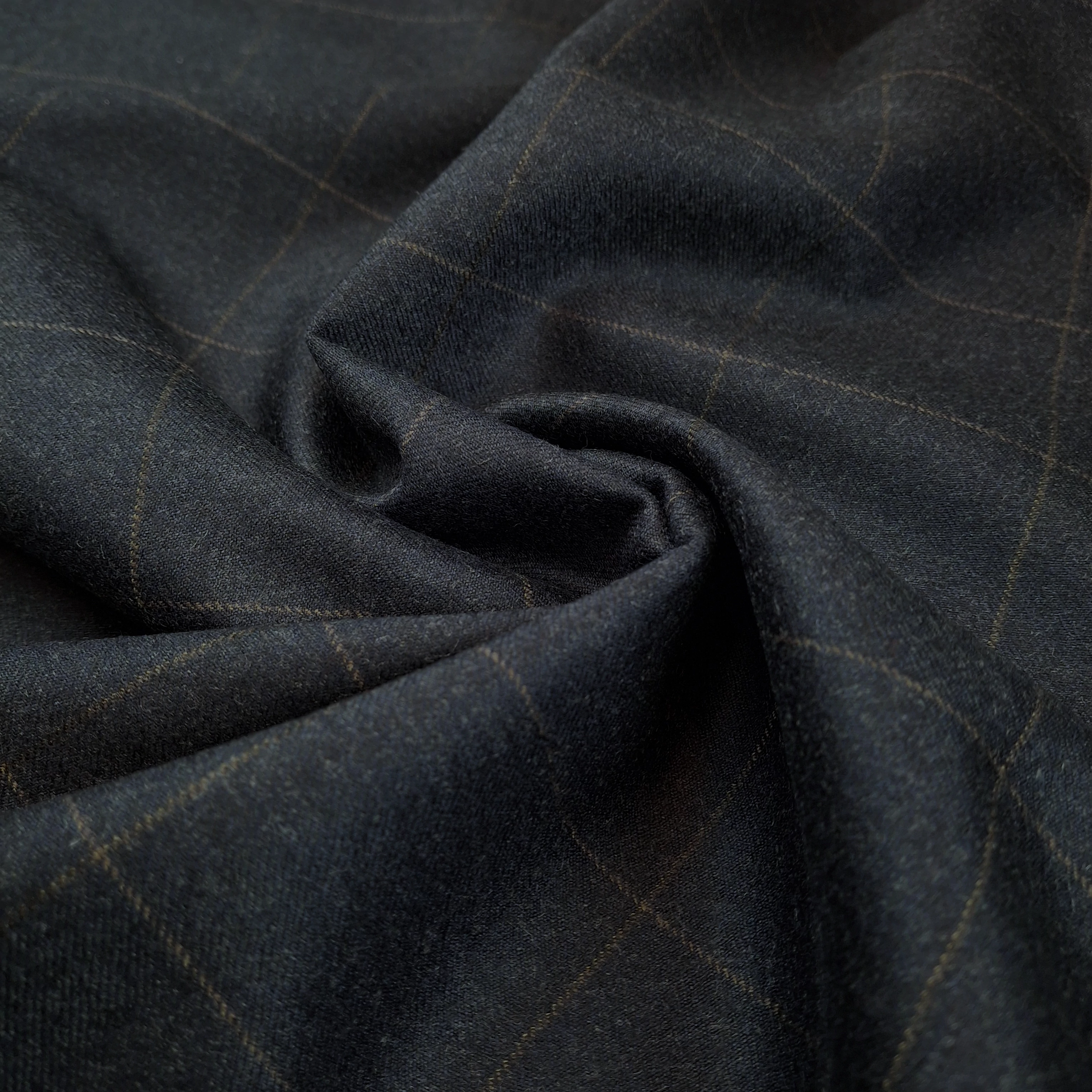 Gyapjú szövet méteráru sötét színben kockás mintával. A minta kockázata 5 x 5 cm-es. Vékonyabb, erős szövésű gyapjúszövet. Gyapjú összetételének köszönhetően igazán jó hőtartó képességgel rendelkezik, így az őszi-téli hónapok megfelelő ruházati alapanyaga. Klasszikus megjelenésű, elegáns, vékonyabb szövet anyag. Nem elasztikus, kellemes, puha tapintású, egyáltalán nem szúrós.