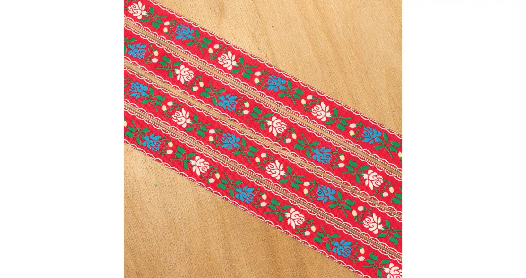 Hímzett szalag – Piros alapon kék-fehér rózsás mintával, 2,5