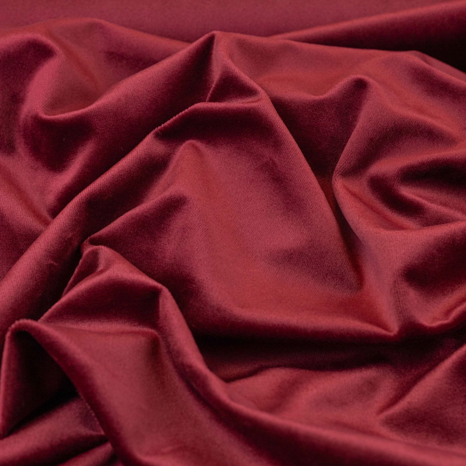 Elasztikus bársony méteráru bordó színben. Kereszt irányban rugalmas, hamvas fényű anyag. Puha tapintású, lágy esésű és kellemes viseletet biztosító alkalmi textil. Felhasználás előtt beavatandó.