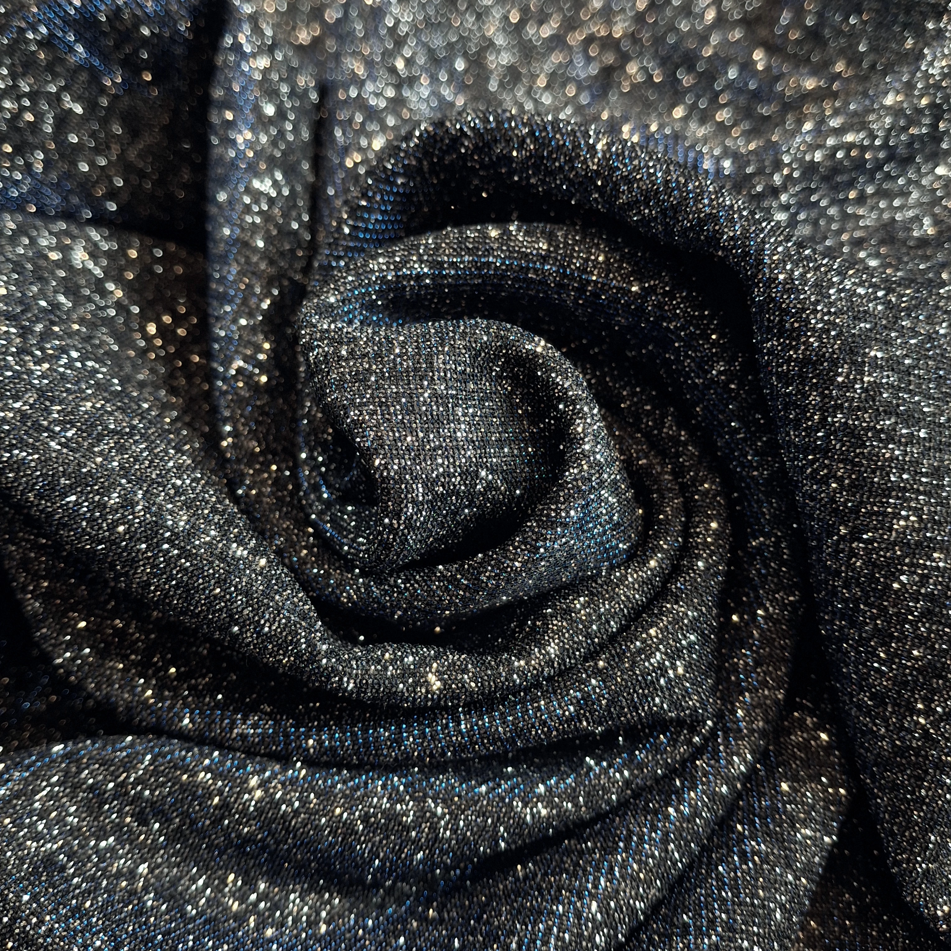 Jersey méteráru ezüst színben, csillámmal, lurex szállal díszítve. Szín oldala kissé érdes tapintású, szép esésű, közepes vastagságú, mindkét irányban rugalmas alkalmi anyag. Felületi gyűrődésein látszódnak igazán a kék színű szálak.