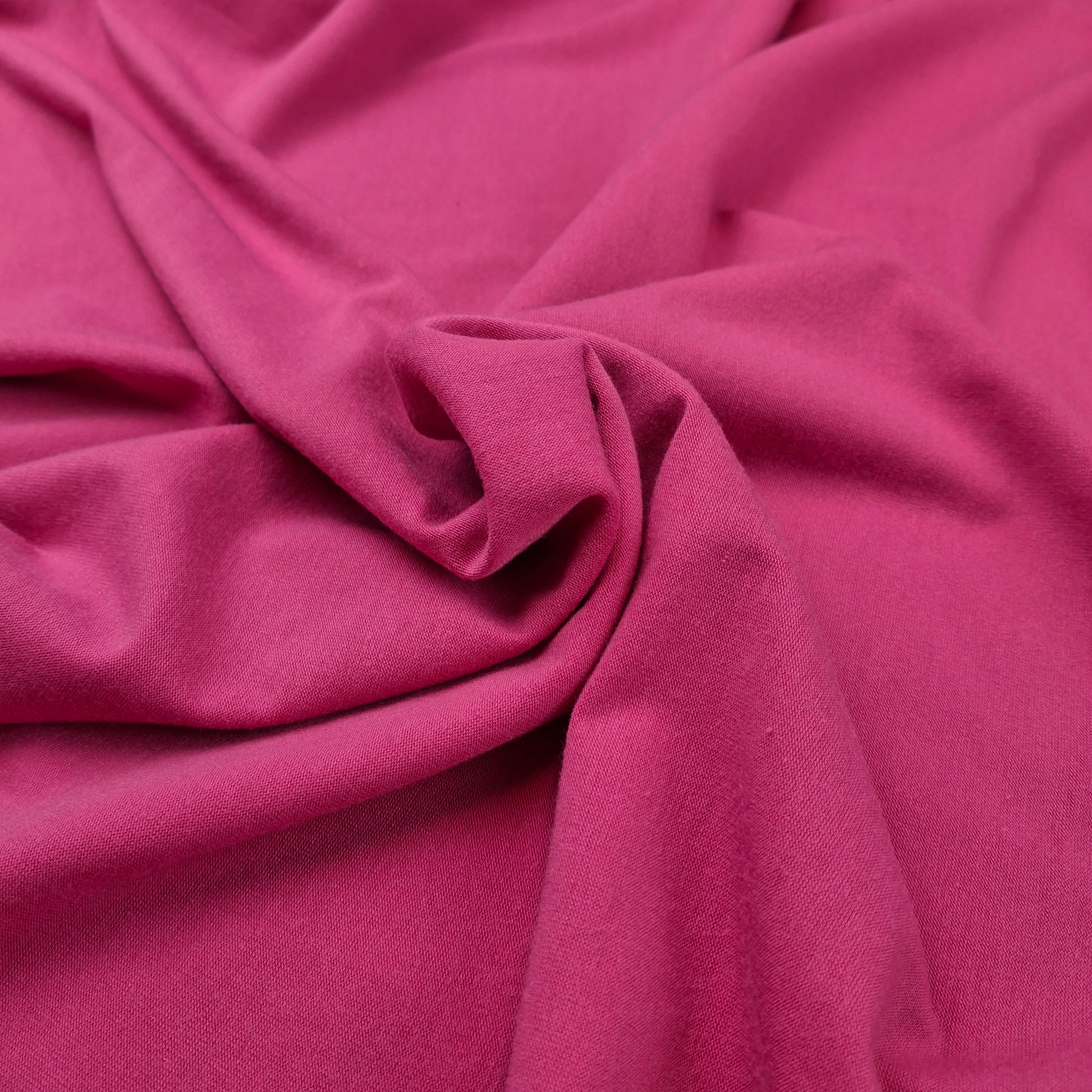 Pamut jersey méteráru sötét rózsaszín színben. Mindkét irányban rugalmas, jól szellőző, puha tapintású és lágy esésű, vékonyabb, pamutos érzetű anyag. Bőrrel érintkezve kellemes, puha viseletű.