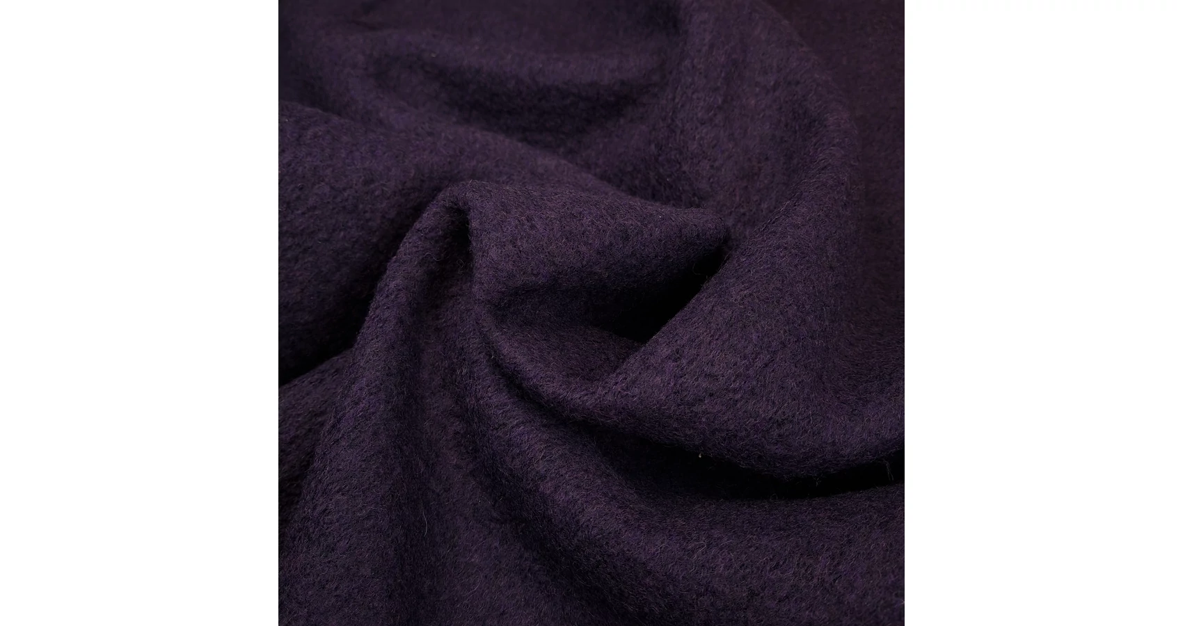 Kötött anyag méteráru sötétlila színben. Nem rugalmas, kellemes, puha tapintású, vastag gyapjú kelme. Bőrrel érintkezve nem szúr. Minőségi, dús anyag téli ruházati termékek készítéséhez.