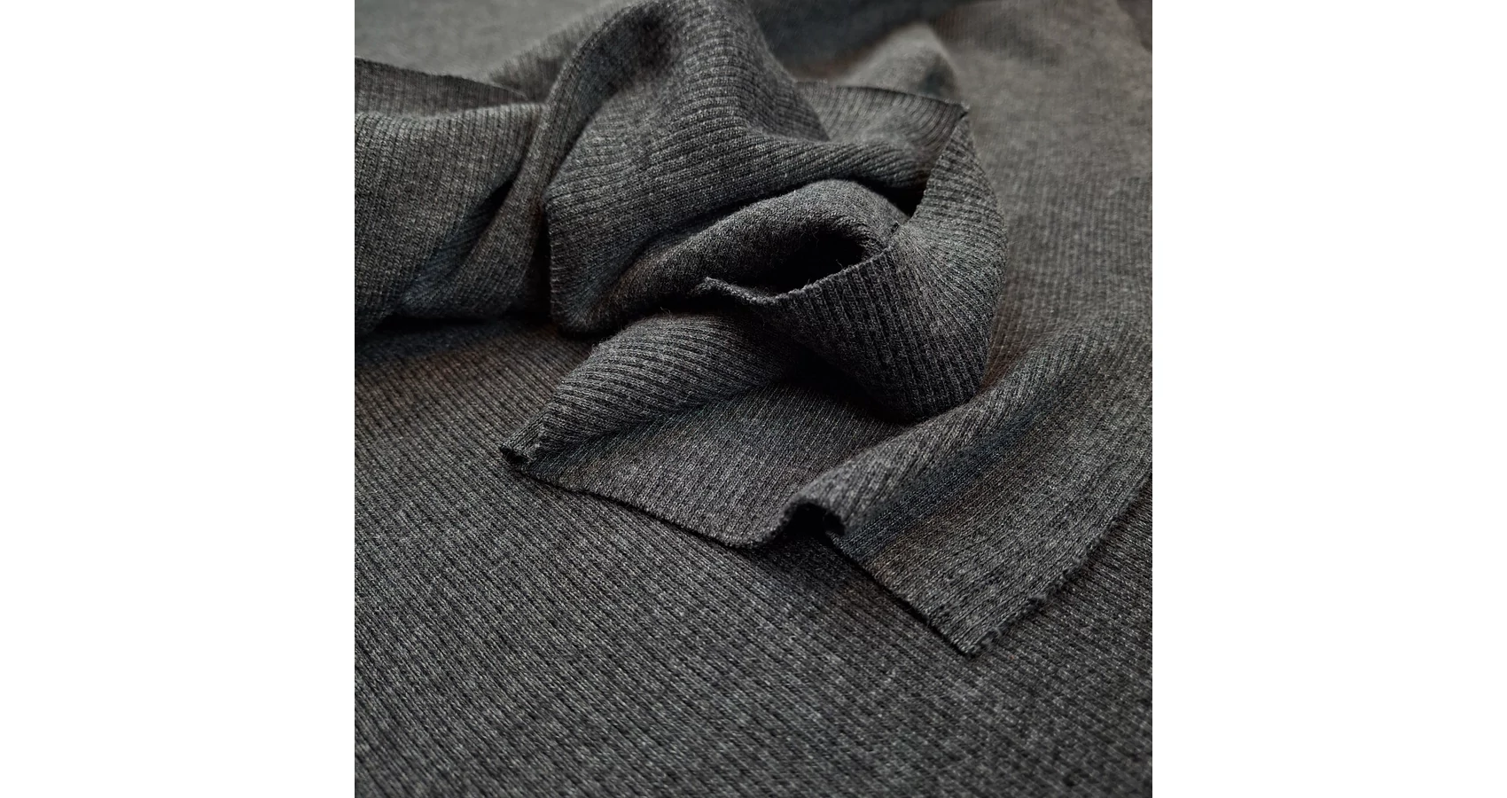 Kötött anyag méteráru sötétszürke színben, passzéhoz hasonló bordás felülettel. Közepesen vastag elasztikus kötött anyag kellemesen puha pamutos tapintással. A belőle lészült ruházati termékek kellemes meleget kölcsönöznek. Kismértékű tartással rendelkezik, így remekül alakítható.