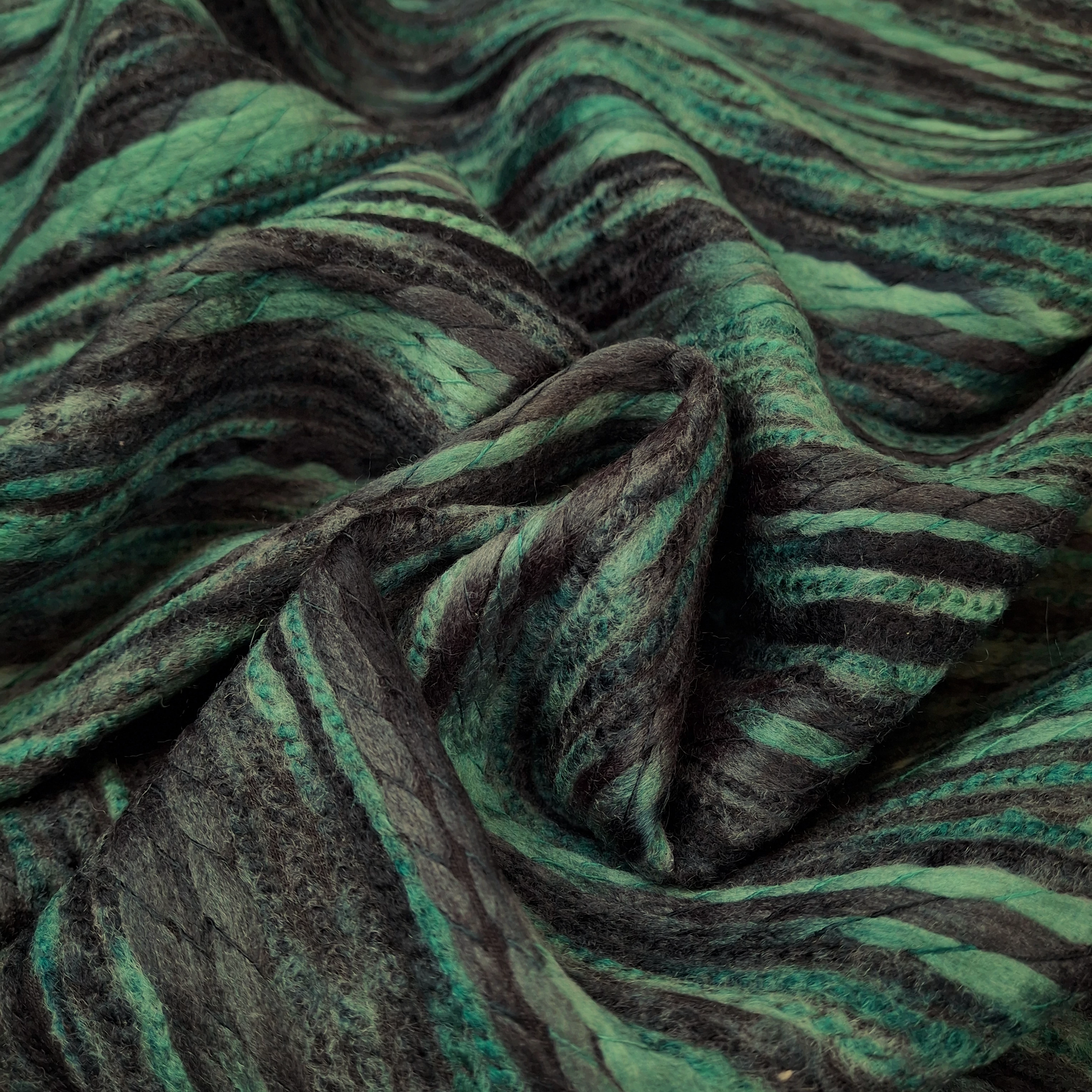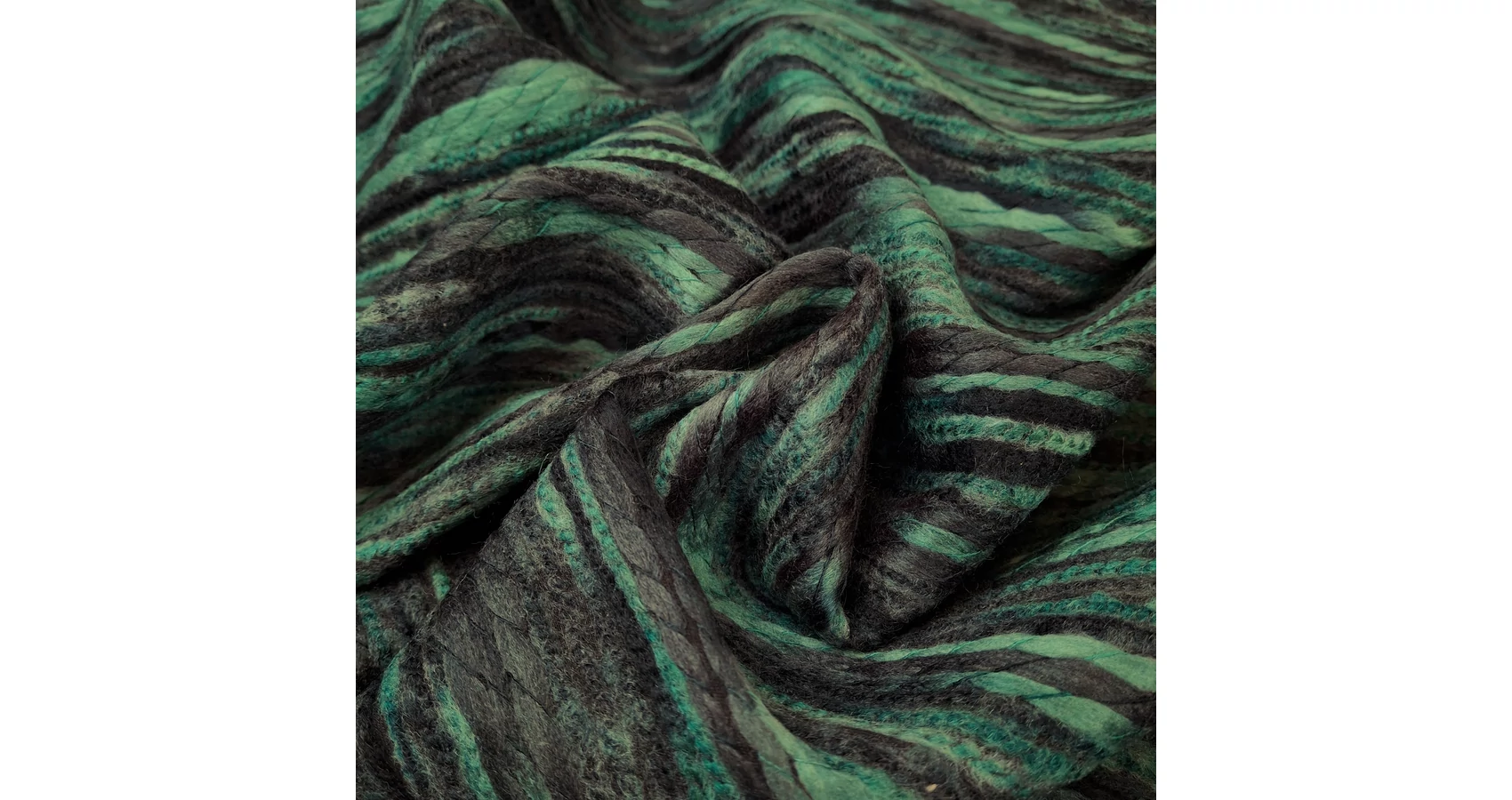 Kötött kelme méteráru fonott szálas mintával, zöld és fekete színben. Kellemes, puha tapintású, vastag kelme. Kereszt irányban rugalmas, ennek ellenére közepes tartással rendelkezik.