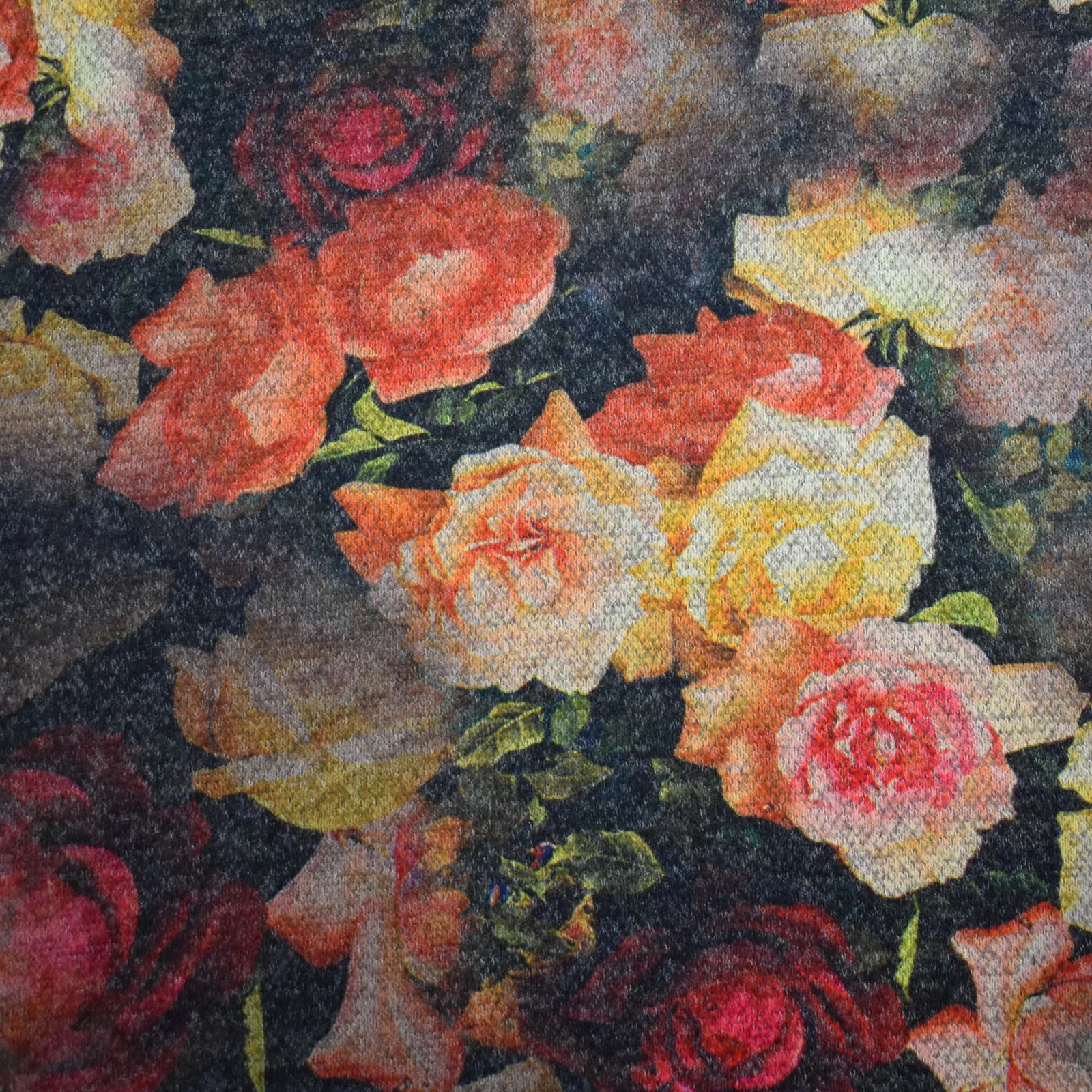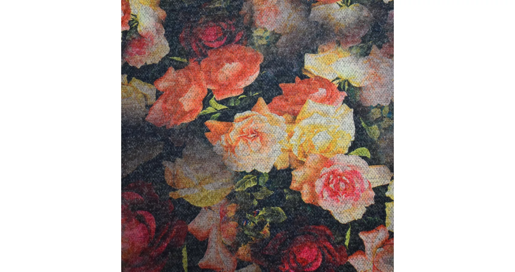 Gépi kötött kelme nagyméretű színes rózsa mintával. Kereszt irányban rugalmas anyagának köszönhetően kényelmes viselet, jól szellőző. Kellemes tapintású, lágy esésű, puha méteráru.