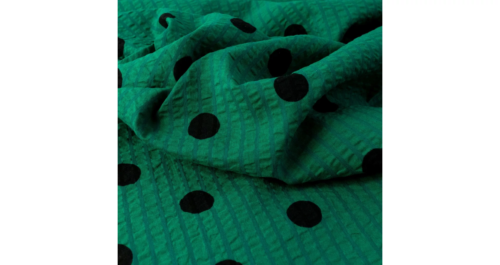 Krepp méteráru zöld alapon fekete pöttyös mintával. Könnyű, matt felületű, gyűrt felületű természetes anyag, mely vasalást nem igényel. Bőrbarát, jól szellőző pamutszövet. Felhasználás előtt beavatandó.