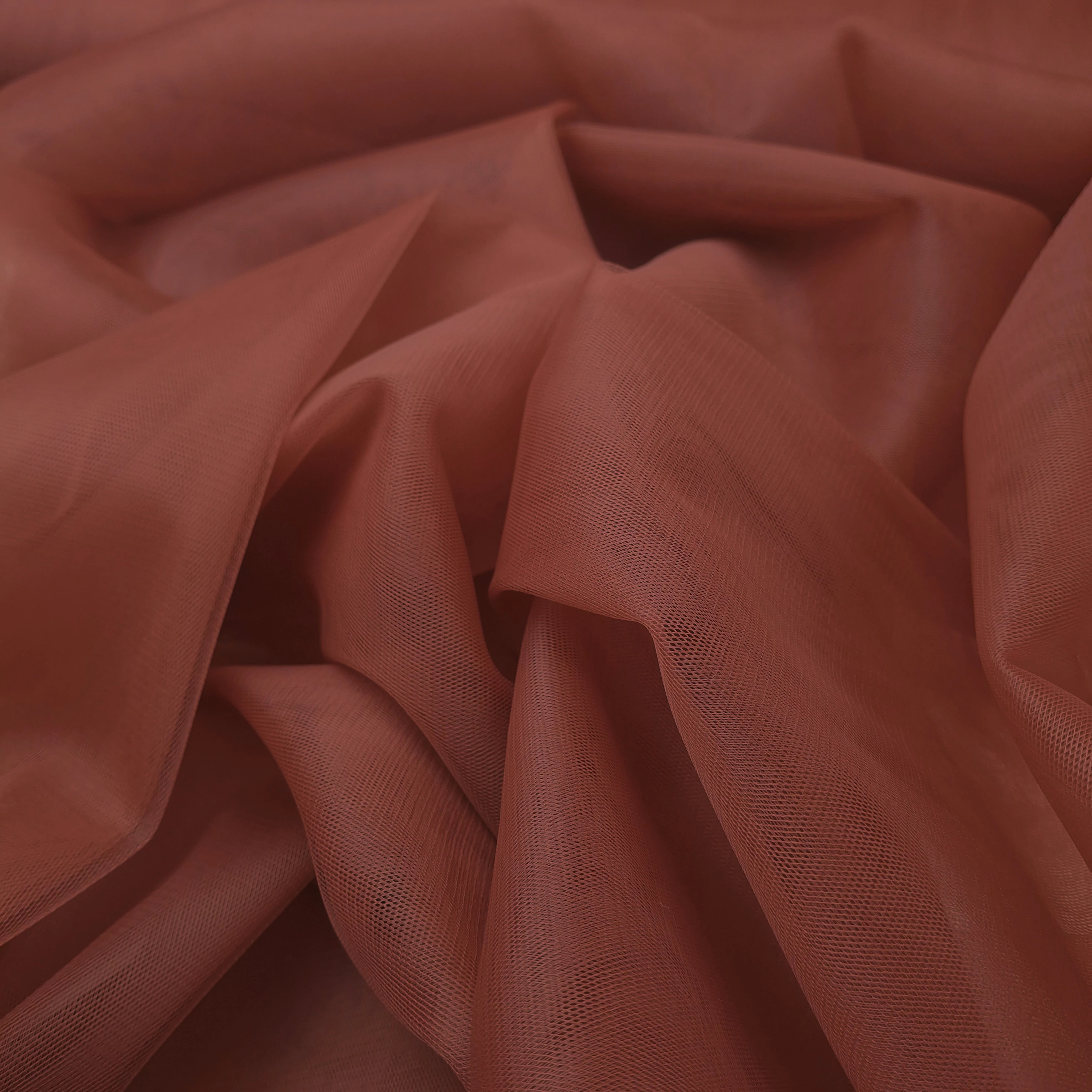 Extra széles tüll méteráru mahagóni színben. Nem elasztikus, szép esésű, lágy tüll anyag, elsősorban ruházati célú felhasználásra.