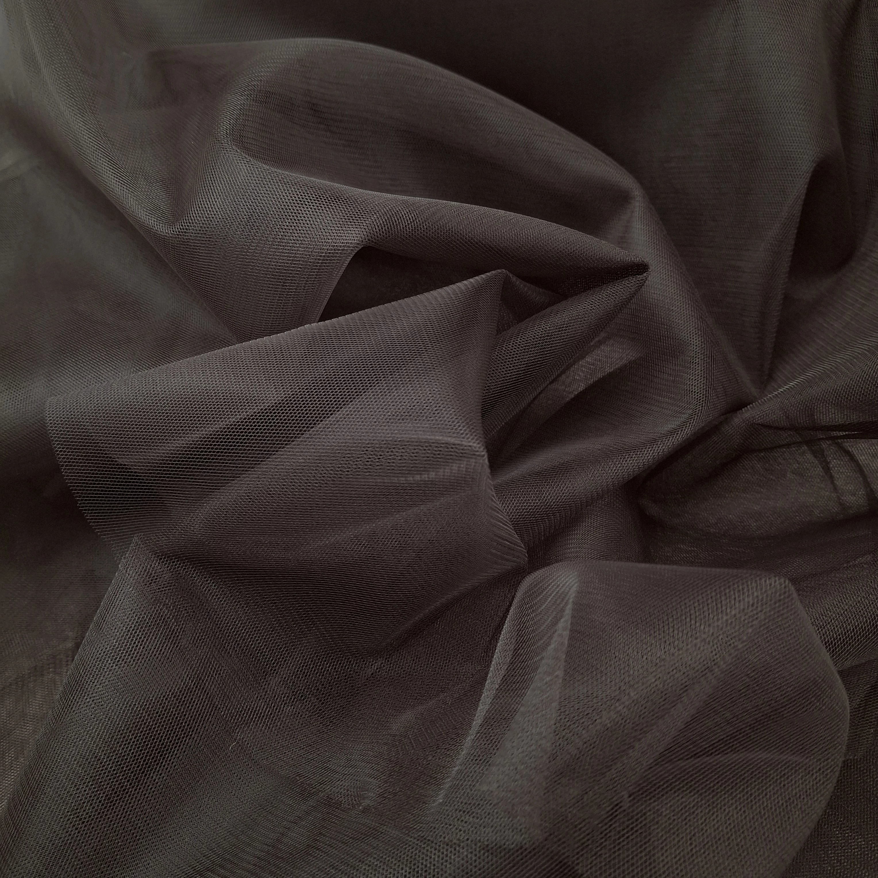 Extra széles tüll méteráru sötétbarna színben. Nem elasztikus, szép esésű, lágy tüll anyag, elsősorban ruházati célú felhasználásra.