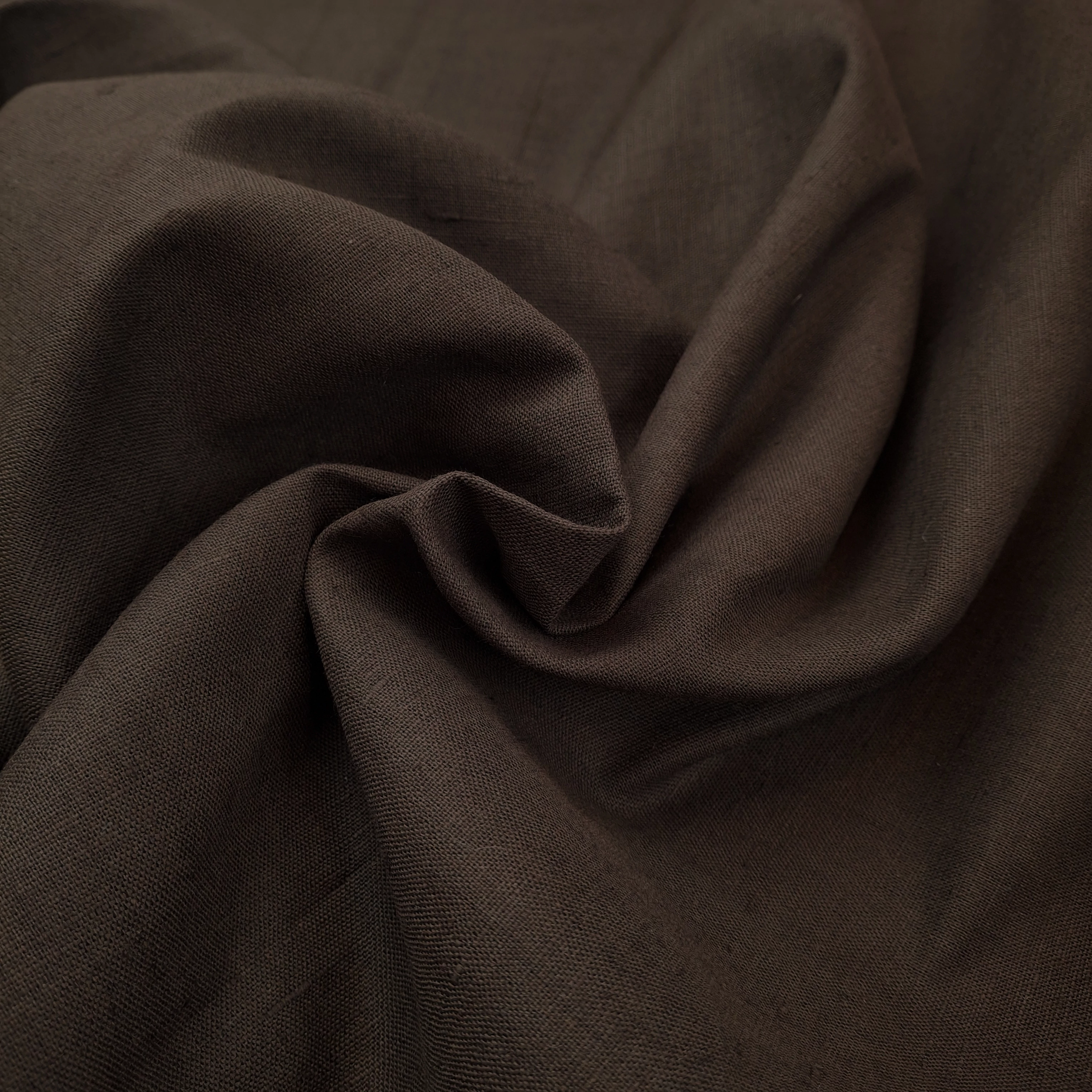 Len méteráru sötétbarna színben. Merevebb érzetű, természetes hatású. Némi tartással rendelkező, közepes vastagságú, 100% len összetételű anyag. Vászonkötésű, jól szellőző, természetes összetételű tavaszi/nyári anyag.