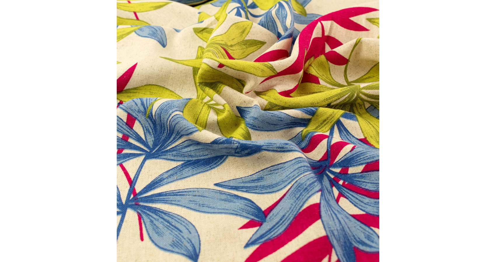 Mintás lenvászon méteráru nyers alapon nagyméretű színes leveles mintával. Vászonkötéssel készült, jól szellőző nyári anyag. A szálkeverésnek köszönhetően tapintása jóval puhább, mint a tisztán len anyagoknak és tartása sem merev. Felhasználás előtt beavatandó.