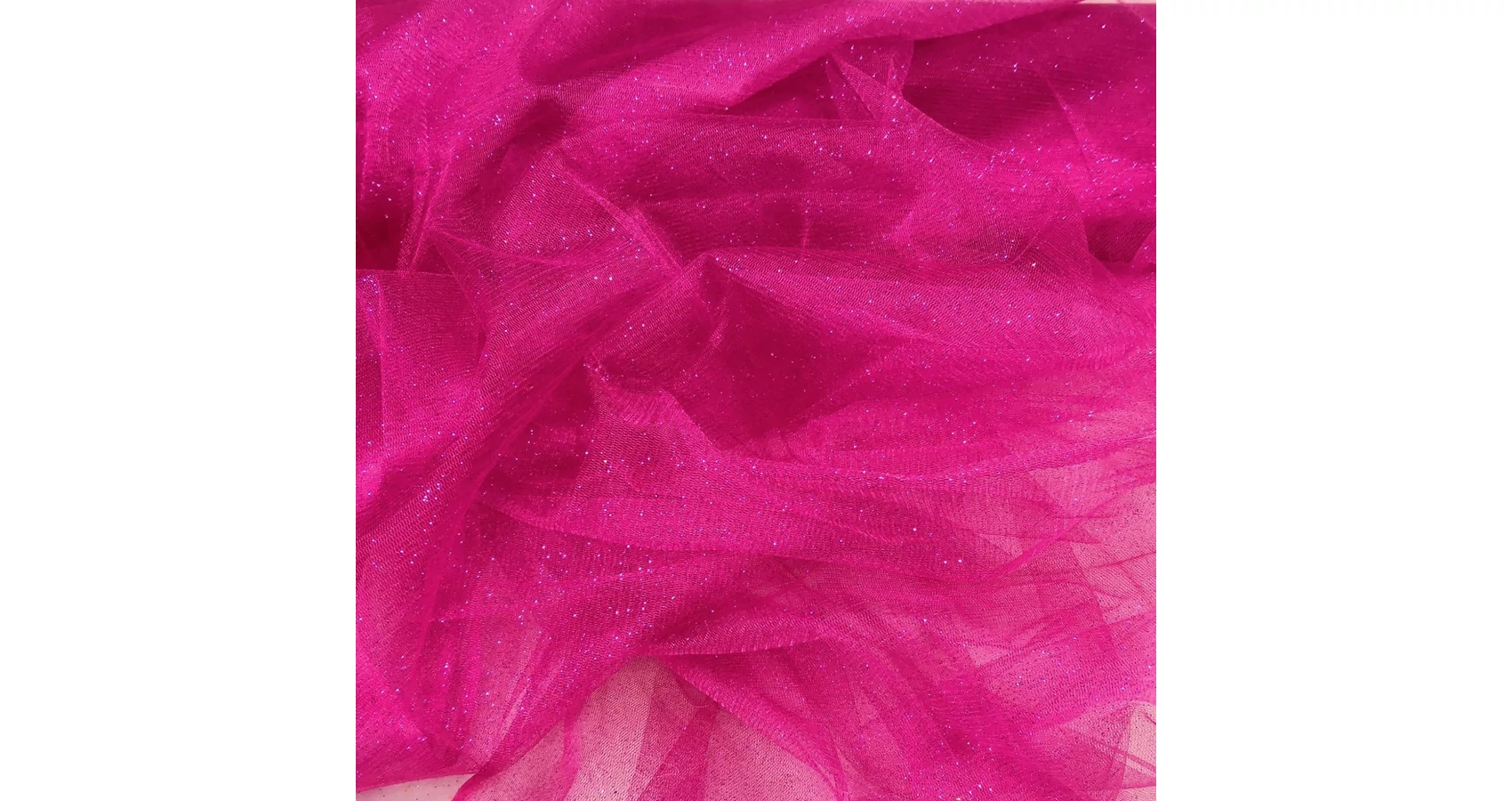 Csillogó tüll méteráru, melynél az élénk pink rózsaszín színű, hálós szerkezetű, leheletvékony anyagot apró rózsaszín színű csillámok gazdagon díszítenek. Elasztikus, közepes tartással rendelkezik, így a dekortüllök közé sorolható anyag. Zsugorodásra nem hajlamos, a nagyfokú csillogás megőrzése érdekében lehetőleg ne, vagy ha mégis muszáj, akkor kézzel mossuk. A csillámok felhasználás során is hullanak, de kellő mennyiség marad az anyagon és sokáig látványosan csillogó lesz.