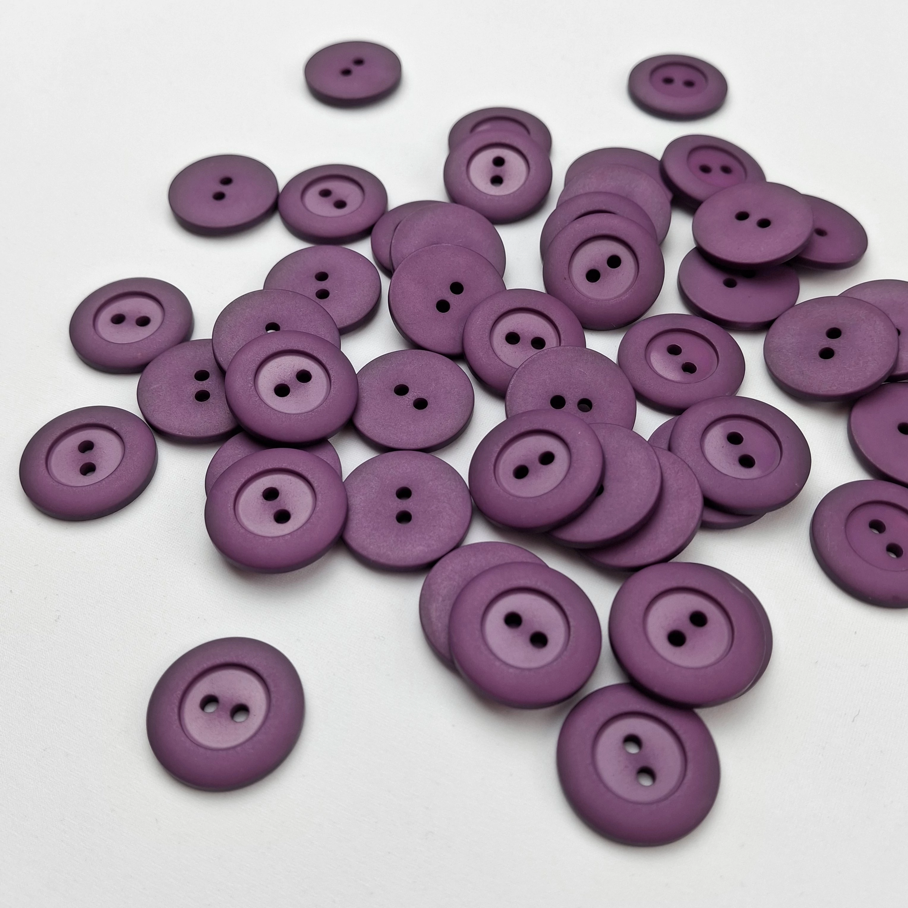 Műanyag gomb lila színben. Dekoratív megjelenésű, matt felületű, kétlyukú gomb.