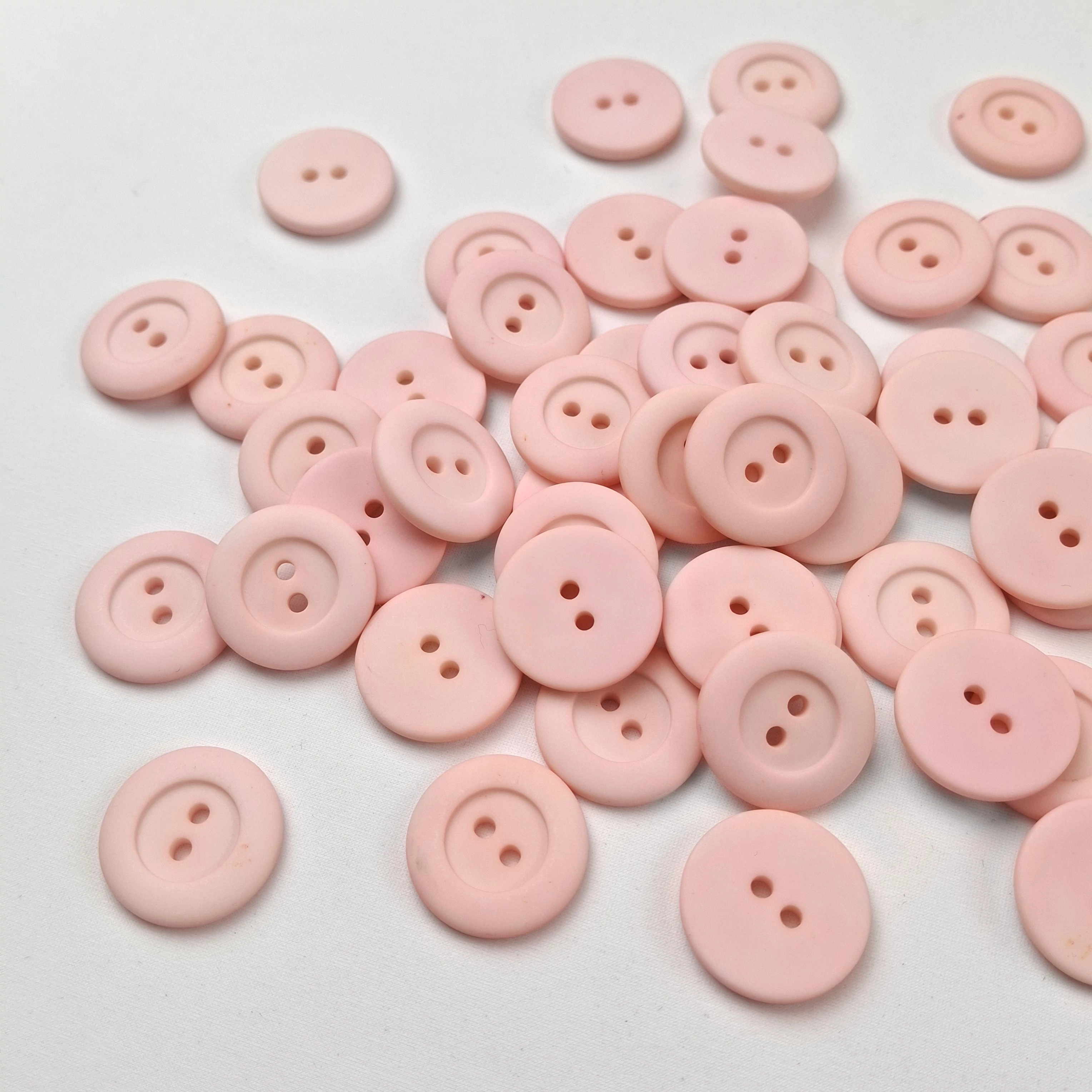 Műanyag gomb púder rózsaszín színben. Dekoratív megjelenésű, matt felületű, kétlyukú gomb.