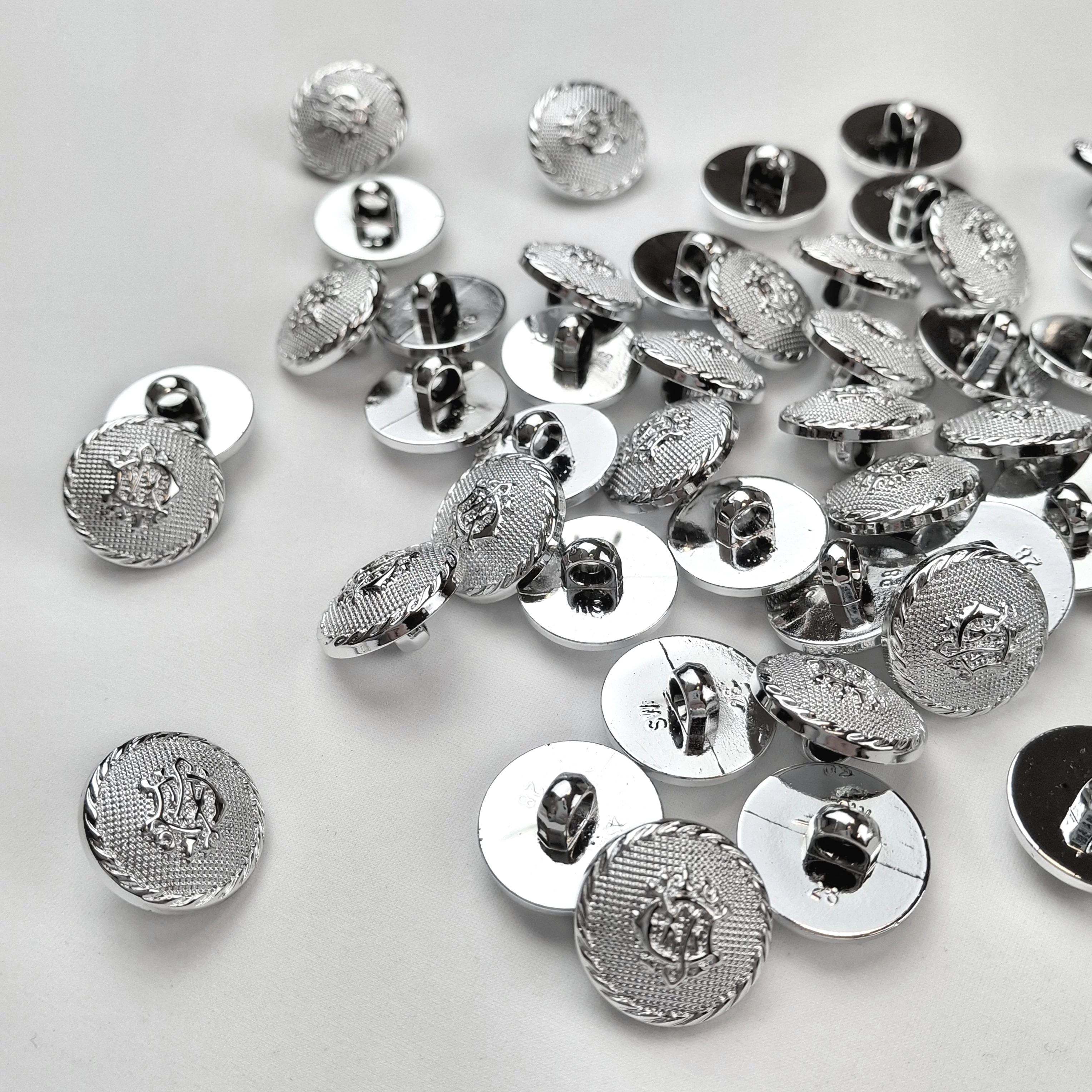 Műanyag ékszergomb/címeres gomb ezüst színben. Hátul 1 lyukban varrós, fényes, sima felületű, elegáns megjelenésű gomb.