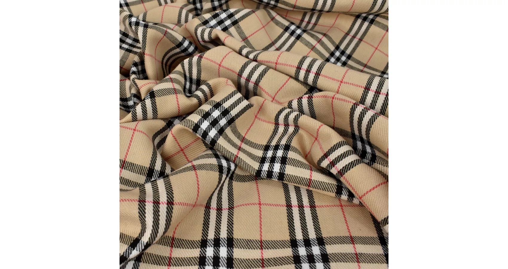 Hagyományos skótkockás mintával készült szövet, melyen barna alapon egymást szabályosan keresztezve futnak a különböző szélességű fehér, piros és fekete csíkok. Kellemes tapintású, lágy esésű, strapabíró anyag.
