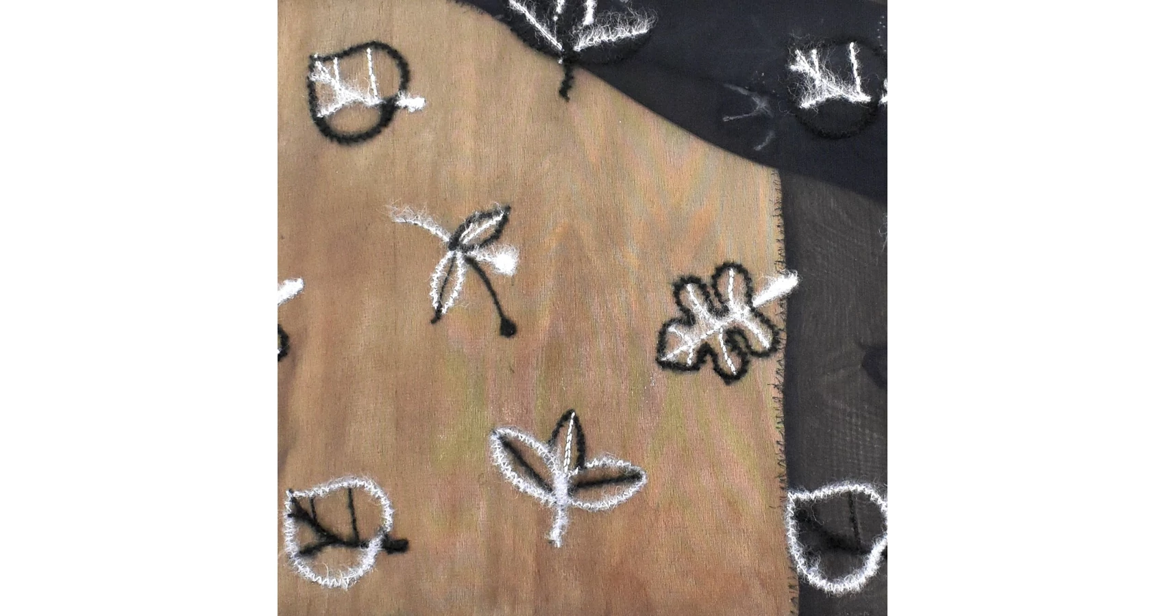 Muszlin méteráru fekete színben, fekete és fehér, nemezelt hatású levél mintával. Nem elasztikus, áttetsző, vékony anyag. Finom esésű, lágy textil, mely gyűrődésre nem hajlamos, szín és formatartó, elegáns női anyag.