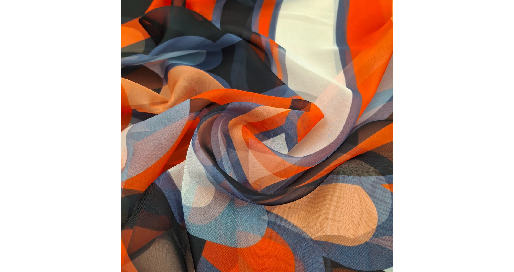 Muszlin méteráru narancssárga és kék absztrakt mintával. Nem elasztikus, áttetsző, vékony anyag. Finom esésű, lágy textil, mely gyűrődésre nem hajlamos, szín és formatartó, elegáns női anyag.
