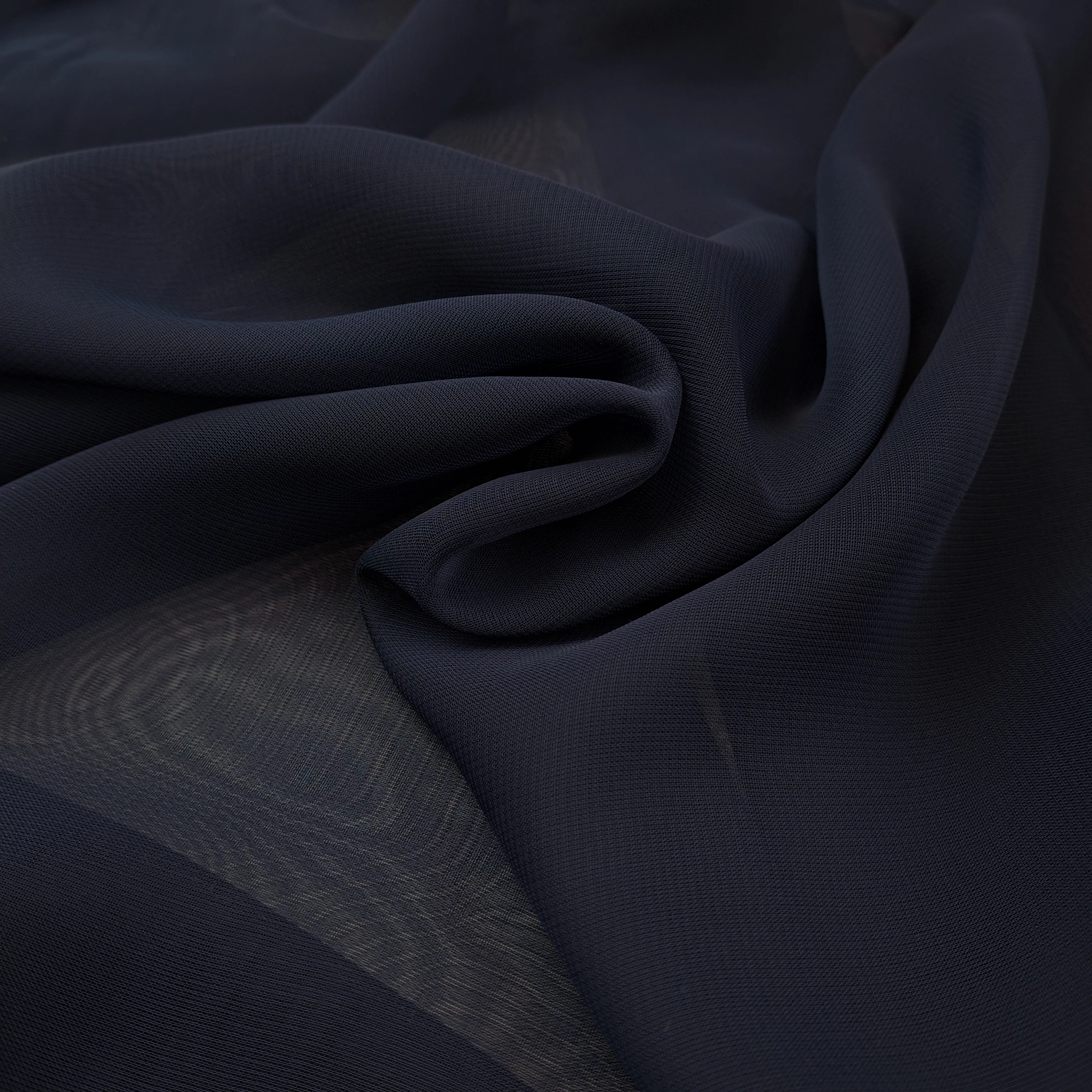 Muszlin méteráru sötétkék színben. Nem elasztikus, áttetsző, lehelet vékony anyag. Finom esésű, lágy textil, mely gyönyörűen libben. Gyűrődésre nem hajlamos, szín és formatartó, elegáns női anyag. Inkább varrásban gyakorlottaknak ajánljuk és vékony (70-es) tűvel érdemes varrni. Ha a tű az anyag szálát meghúzza, az kézzel szépen visszagúzogatható.