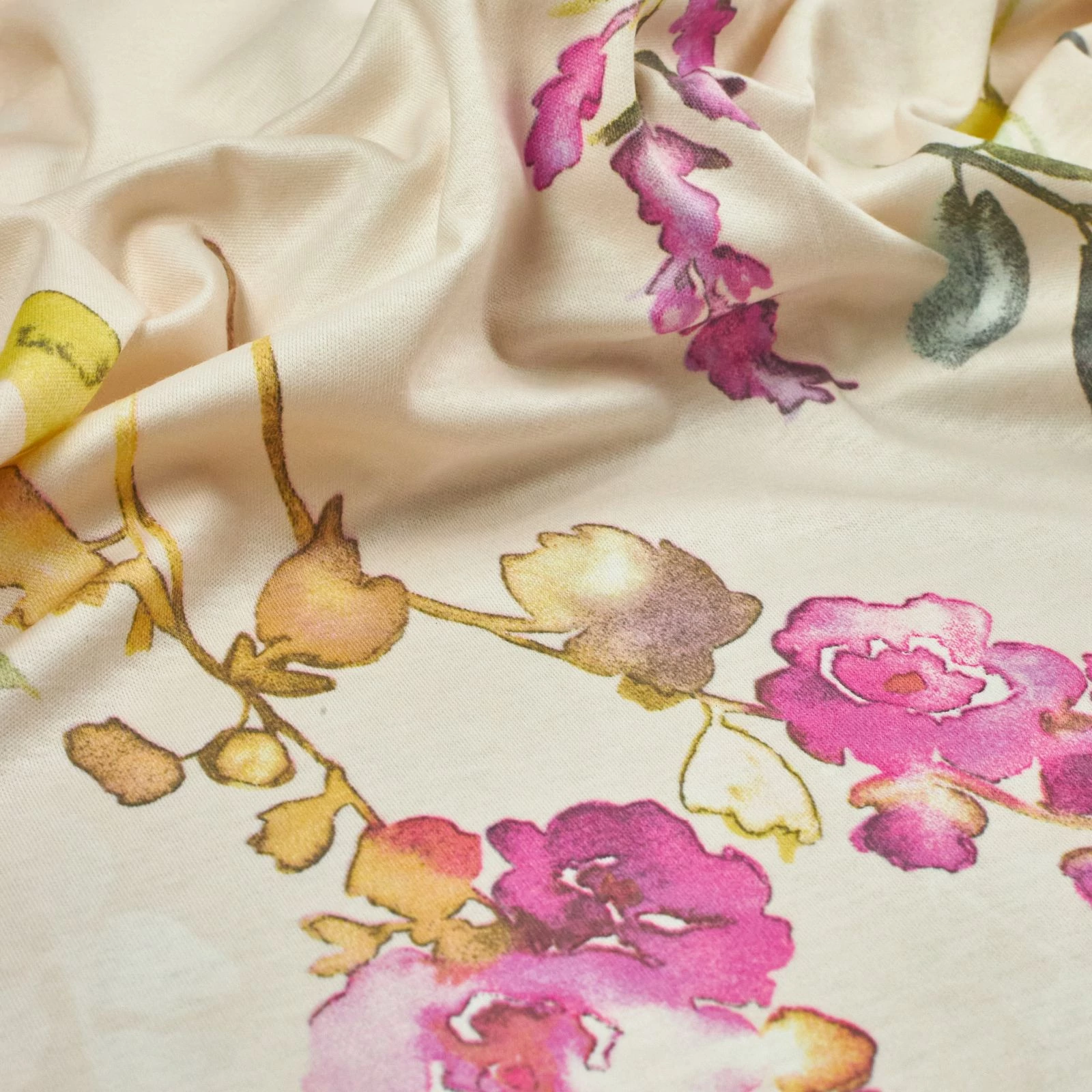 Pamut jersey méteráru halvány barack alapon pasztelles színvilágú virágos mintával. Sima felületű, lágy esésű, rendkívül puha tapintású, mindkét irányban rugalmas textil. Jó nedvszívó képességű, jól szellőző, kellemes viseletet biztosító anyag. Felhasználás előtt beavatandó.