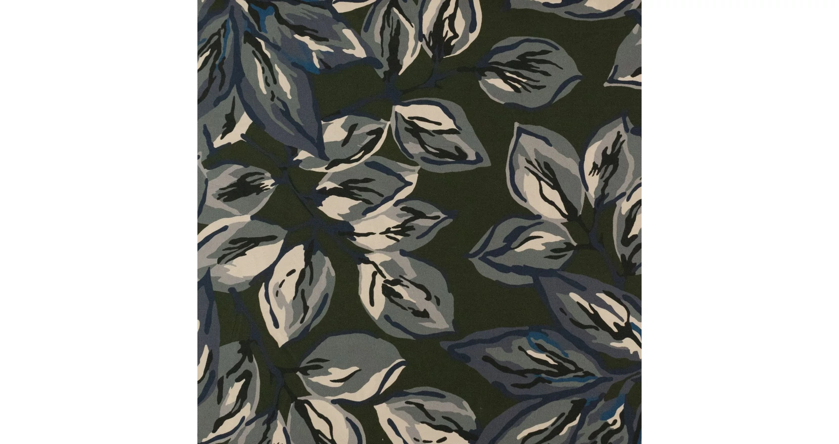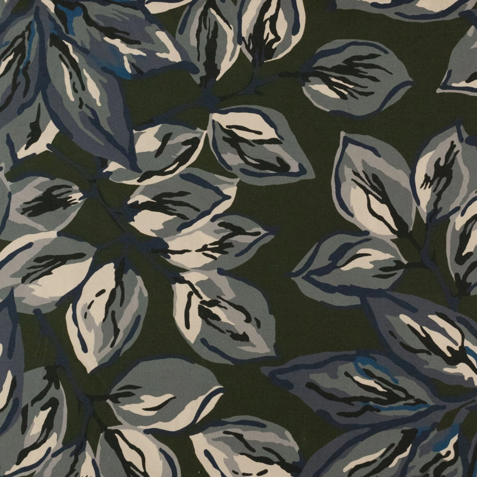 Pamut puplin méteráru olajzöld alapon szürke és kék színű levél mintával. Sima felületű, hamvas fényű, kissé hűvös és csúszós tapintású textil. Sűrű szövésű, kereszt irányban elasztikus, jó szakítószilárdságú nyári textil. Felhasználás előtt be kell avatni.