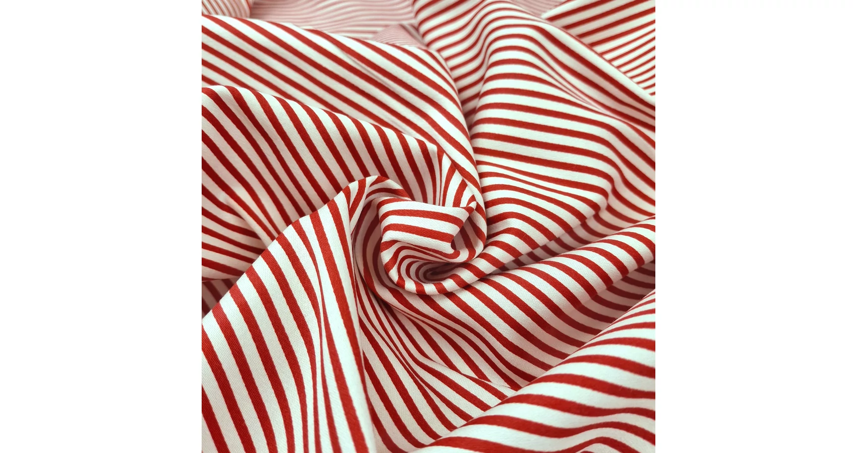 Elasztikus pamutszatén méteráru piros-fehér csíkos mintával. A csíkok vastagsága 3 mm. Sima felületű, pamutos puha tapintású, kissé elasztikus, sűrű szövésű, jó szakítószilárdságú anyag.