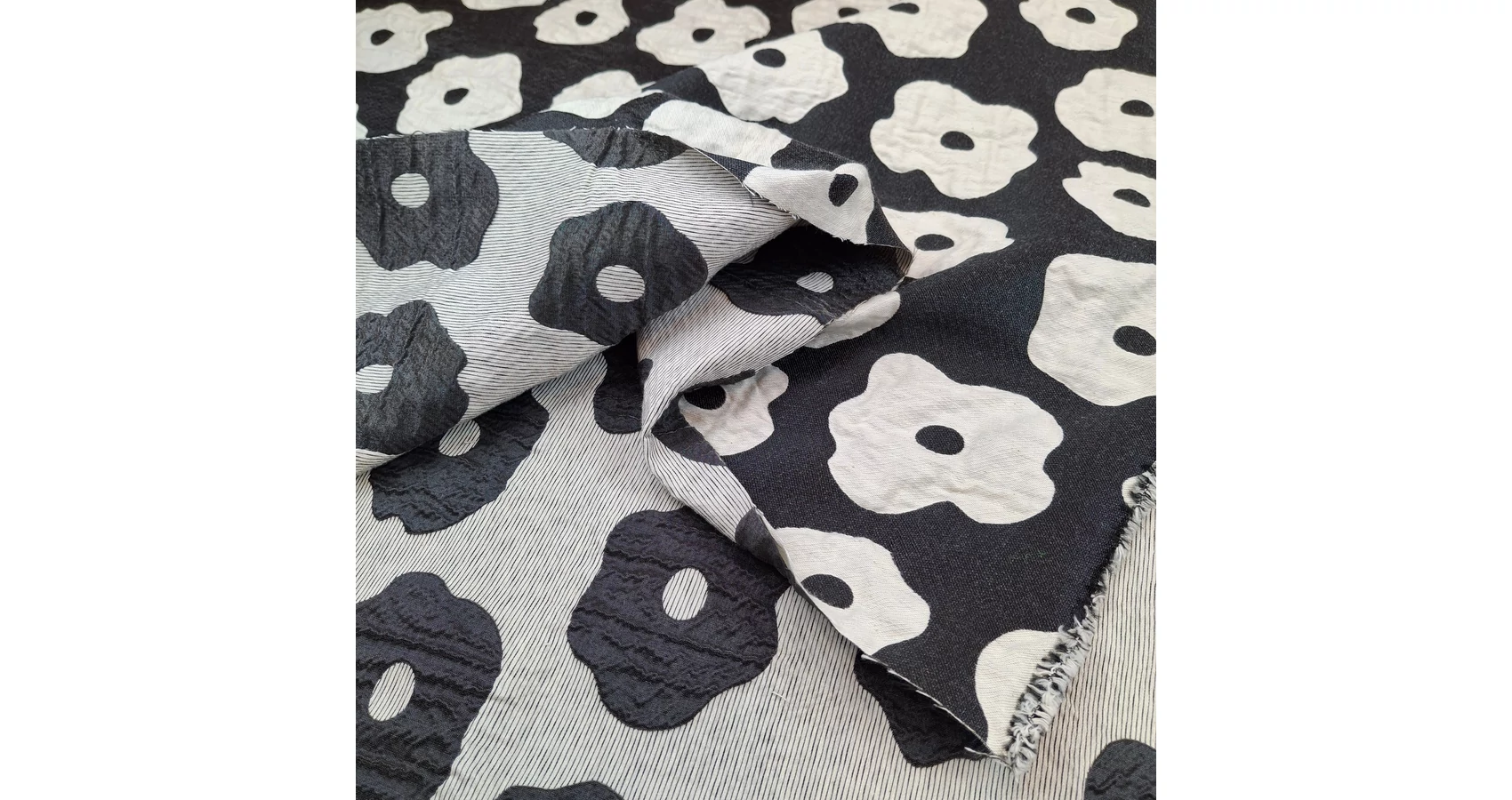 Pamut szövet virág mintával, kétoldalas kivitelben. Felülete kissé gyűrt, a mintának köszönhetően helyenként kismértékben domború hatású. Nem rugalmas, némi tartással rendelkező, kissé kreppesen matt felületű anyag. Egyes szögekből kissé fényes felülettel rendelkezik. Dús, minőségi kelme, amelynek mindkét oldala egyaránt hasznosítható.